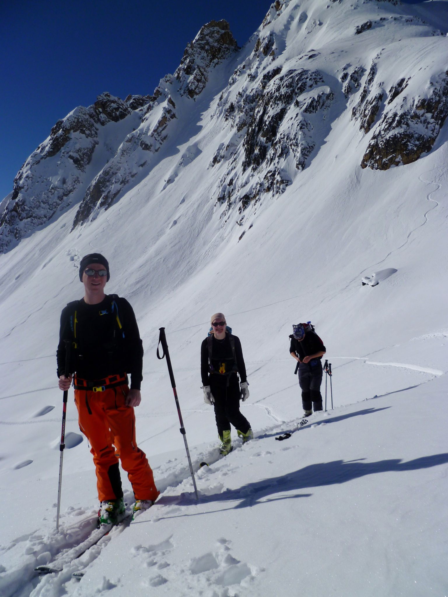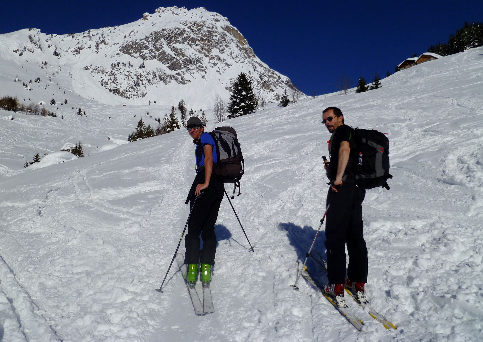 La descente s’amorce, et même à l’ombre, la neige est plutôt lourde. Alex godille, les autres prennent plus ou moins de plaisir jusqu’au refuge de la Balme. A partir de là c’est le petit train plat dans la vallée, et mieux vaut avoir des skis bien fartés pour ne pas pousser. Nous rejoignons ensuite la foret et le parking où nous somme garés, la boucle est bouclée!