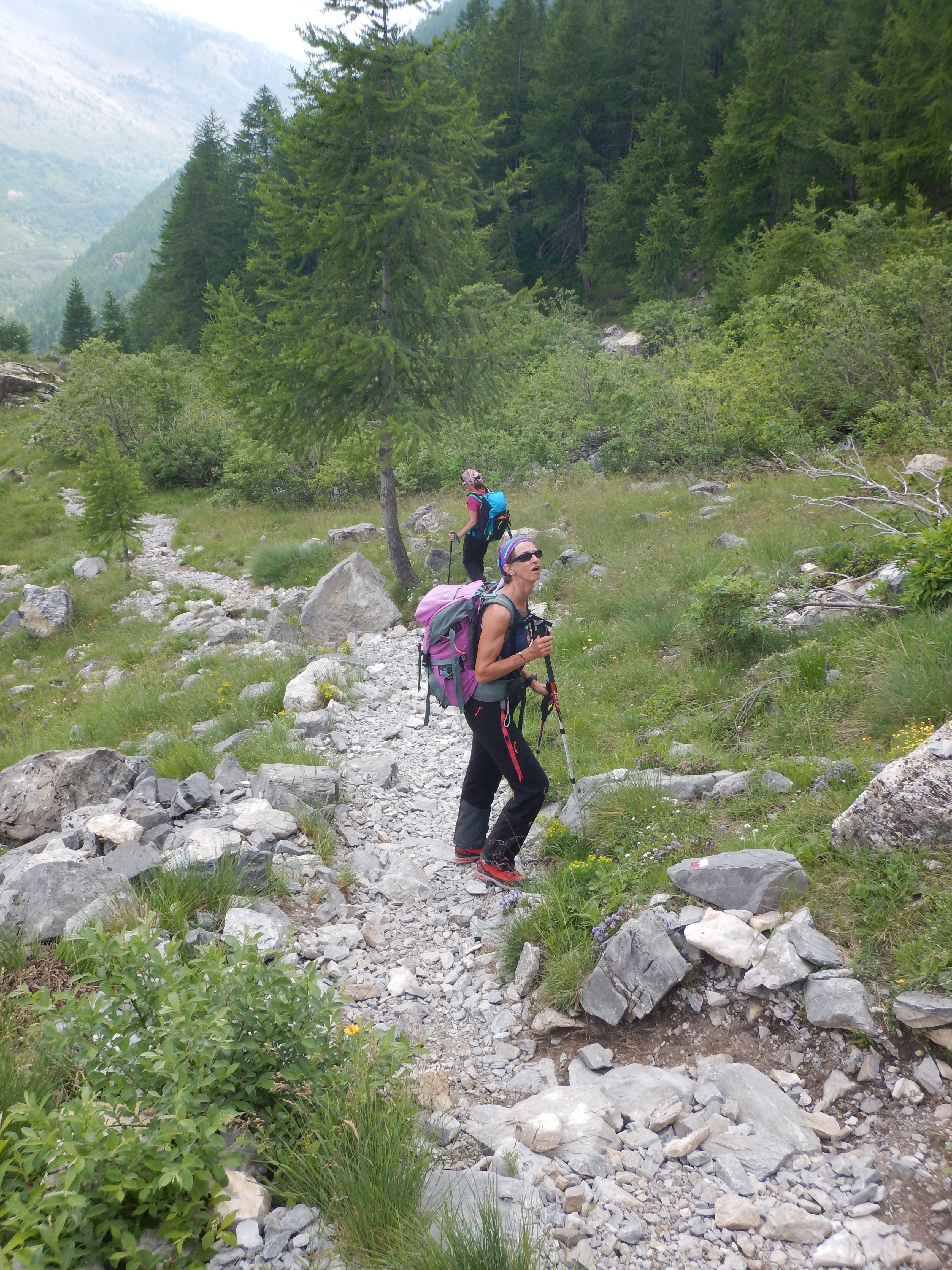 2ème surprise (qui n’en ai pas 1): la météo annoncée la veille s’avère exacte. Les sommets italiens ont revêtu leurs chapeaux de nuages.Nous avons donc nous mêmes revêtu nos gore tex et avons monté jusqu’à Escalon sous la pluie 2h durant.