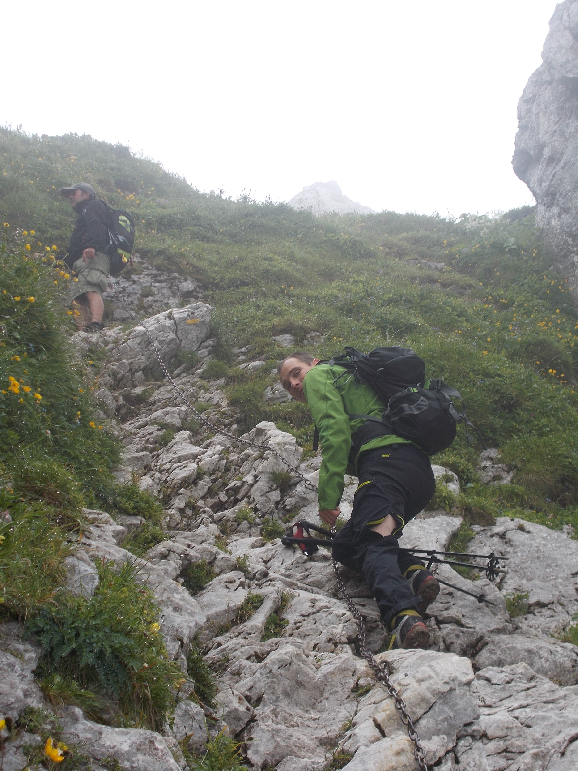 Puis nous empruntons un couloir assez raide, des chaines nous facilitent la montée. Le brouillard nous enveloppent délicatement et crée une ambiance « fantômatique ».