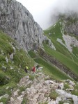 Nous franchissons une dalle très exposée mais sécurisée par une main courante, le sentier est pentu, nous perdons rapidement de l’altitude, lacets et couloirs pierreux, passage le long du rocher toujours sécurisé par une chaine. mais que de gadoue!!