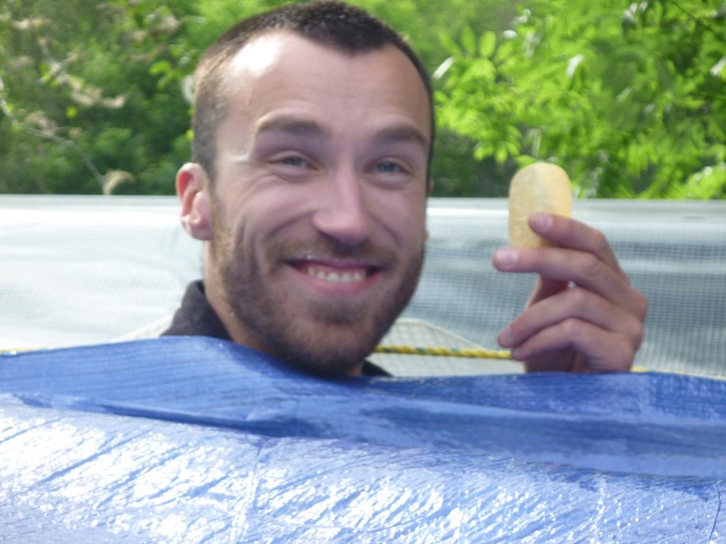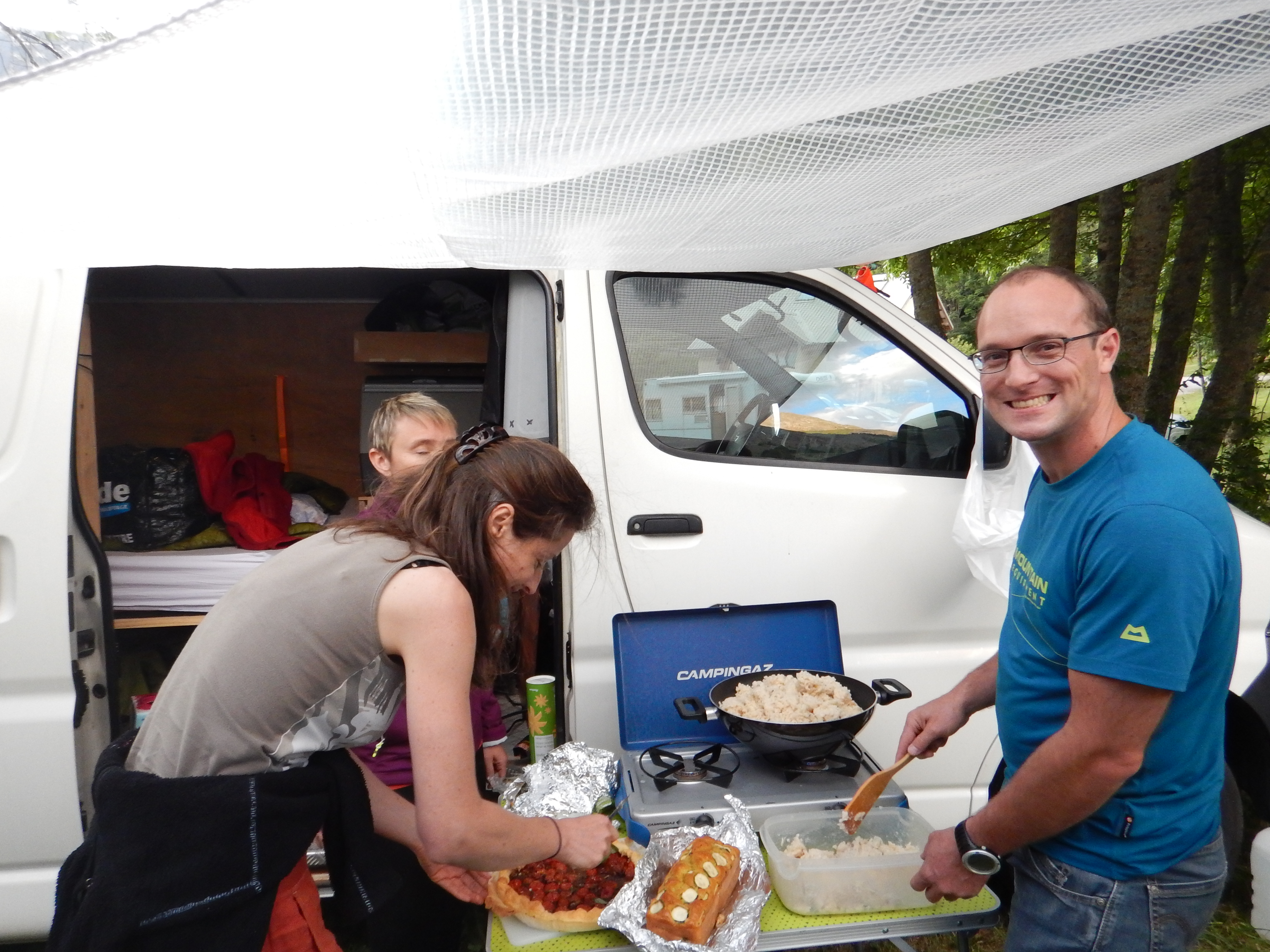 Vendredi soir après une arrivée tardive de certains , qui a laissé le temps aux autres de monter tente et tipi , nous nous Retrouvons autour de quelques bières et de bons petits plats maison. Au hasard je citerais la classe internationale du risotto aux cèpes de cedric et l excellent cake aux framboises de Virginie.