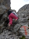 Nous rejoignons alors le passage des cheminées de Sallanches.Un nuage soupoudre alors quelques gouttes d’eau. Aie, y va-t-on ou pas? Ce n’est que 3 4 gouttes. Nous entamons la partie escalade de cette rando. Nous sommes alors à environ 250m du sommet.