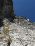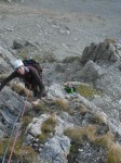 Une fois au pied de la fameuse dent, la grimpe commence. Facile au début, ça devient de plus en plus compliqué. « T’es sur que c’est du 4sup ça??? » Nous sommes sur une face nord-ouest, bien à l’ombre et la roche est glaciale… difficile de sentir les prises avec des doigts gelés! Les prises de pieds ne sont pas forcément plus rassurantes avec les grosses chaussures.