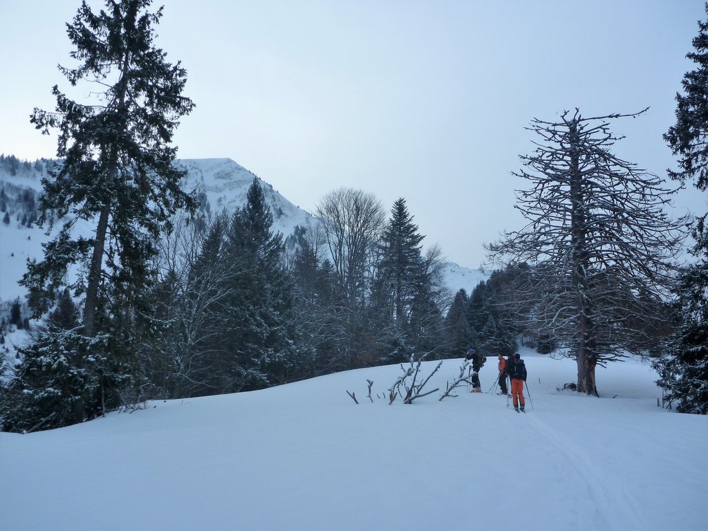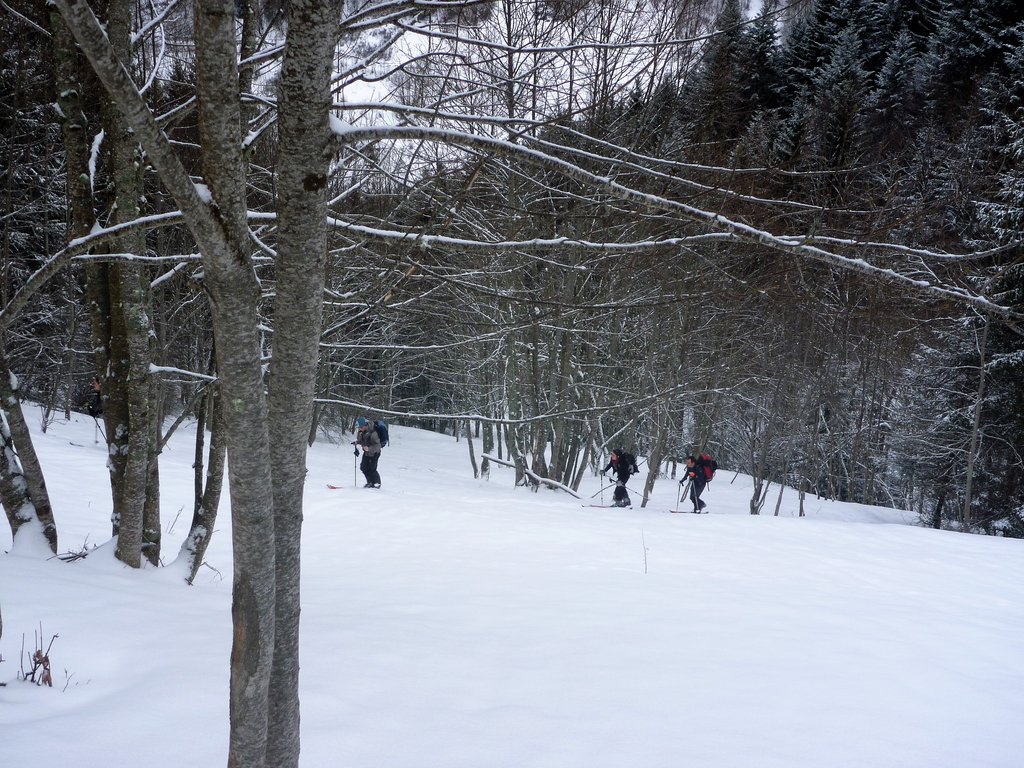 C’est donc à proximité de la chapelle Notre Dame de Bellevaux que nous chaussons les skis. Le ciel est dégagé. Nous partons avec un rythme soutenu. La montée est assez raide et s’effectue principalement en forêt. Le manteau neigeux est mince et nos skis se prennent facilement sous les racines des arbres. La descente s’annonce épique !