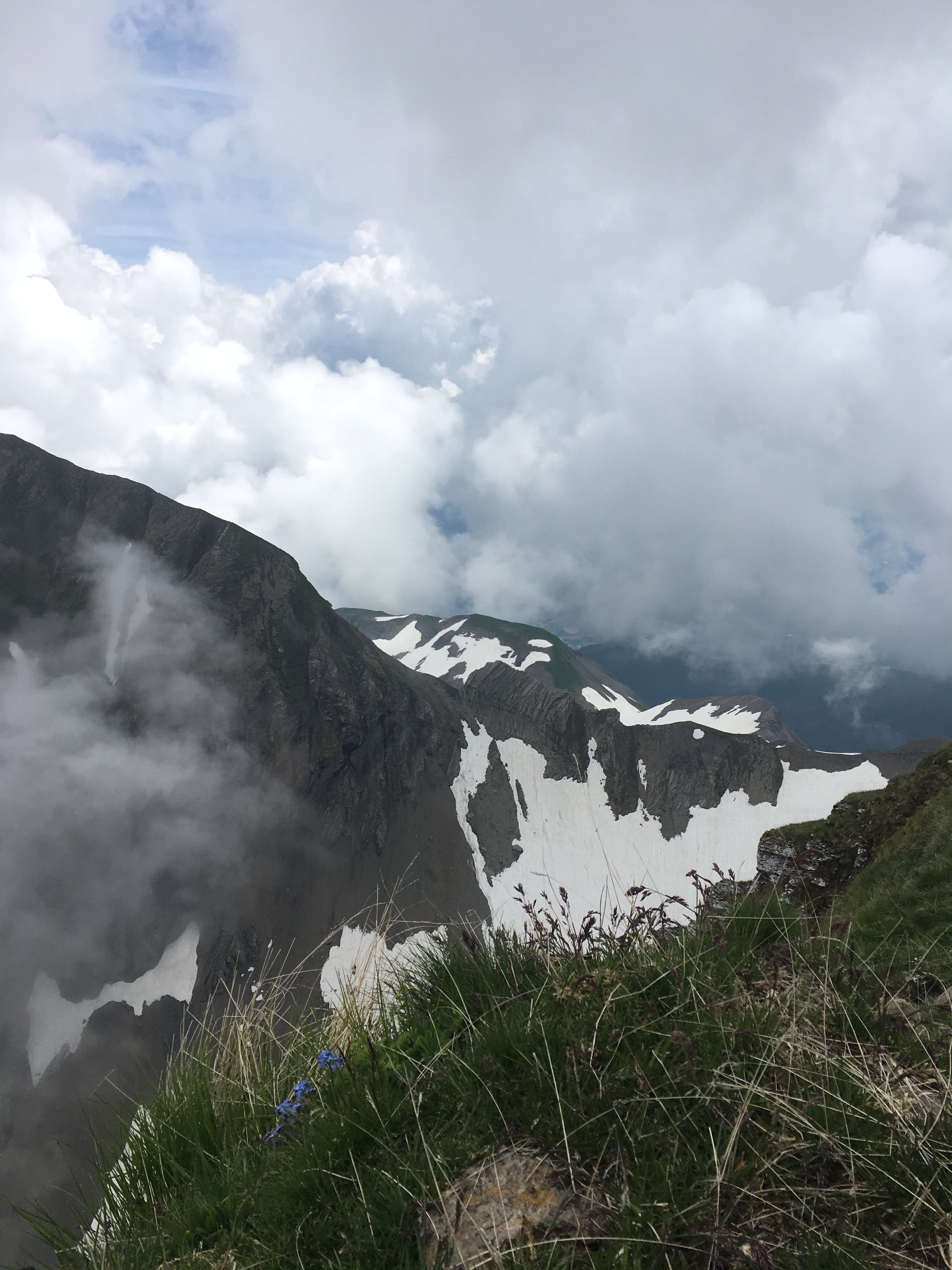 Une longue avancée en terrain enneigé nous attend, nous continuons en direction du sommet. La tête dans les nuages et le postérieur dans la neige à plusieurs reprises pour certains d’entre nous. Ceci engendrant bien des fous rires !!
