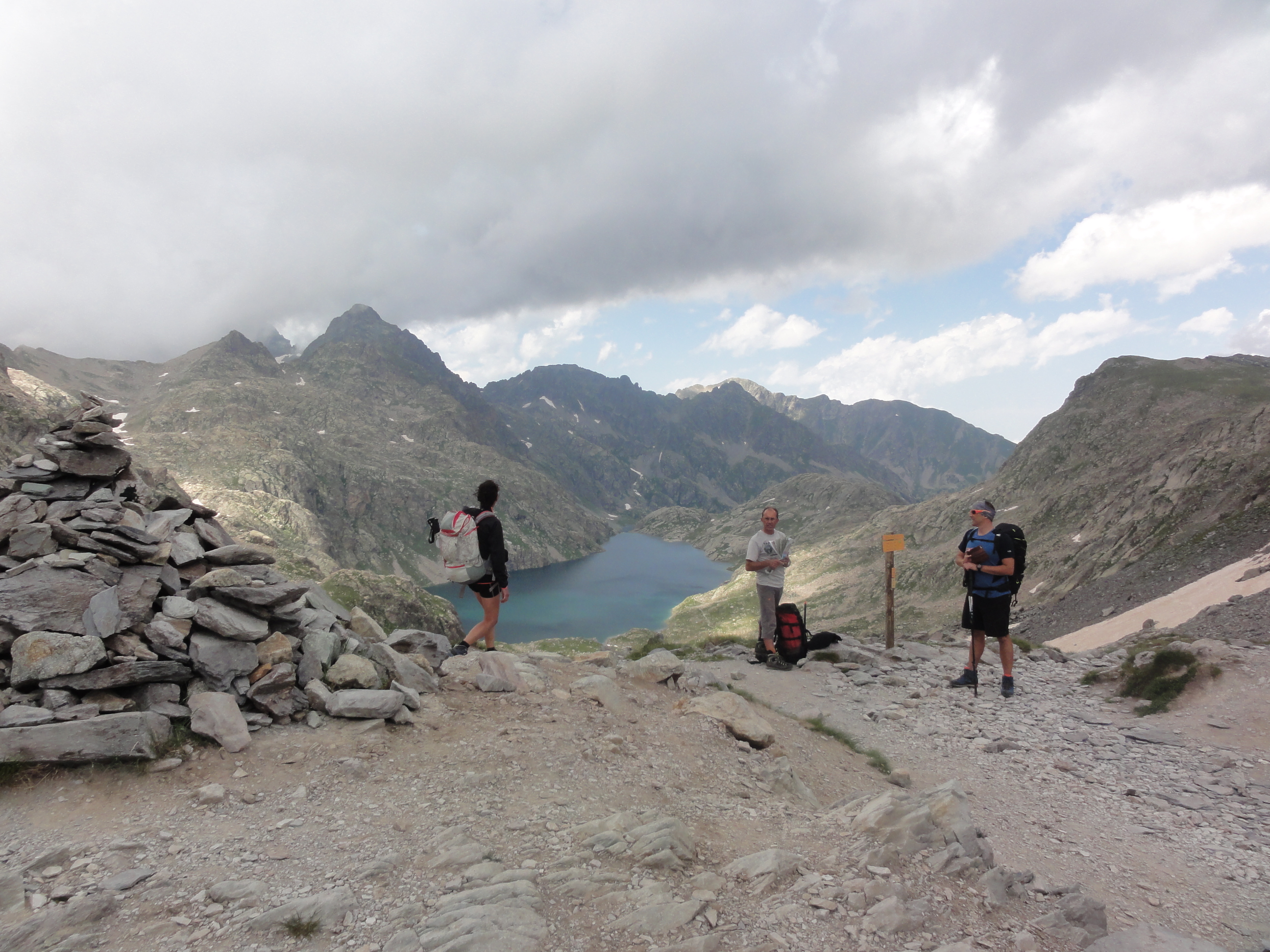 Catégorie: Randonnée pédestredu 14 juillet 2018 au 21 juillet 2018Journée 1Voilà ,on y est !Depuis des semaines que je peaufine le programme de cette semaine « Mercantour Tour « que j’ai bien vendu à 5 Gumistes enthousiates et affûtés (enfin certains…) :je réserve, j’annule,j’explique ,je ré-explique (matos,horaires,logistique,etc .. ) .Le trajet en Peugeot Expert 6 place 250 000 km au compteur est passé comme une lettre à la Bonette !Casse croûte au coucher du soleil à Halte 2000 :magistral timing et ambiance fort sympathique (notez l’adresse :route de la Bonette à 2000m d’altitude).Une nuit tranquille sous la tente fixe avec couettes et oreillers au gîte de Boréon (point d’arrivée dans 6 jours).Un taxi nous transfert ce matin dans la vallée suivante à une 30 taine de km au Pont du Countet ,les sacs sont lourds pour certain(e)s (nous comprendrons plus tard pourquoi …) .Direction la Vallée des Merveilles par le Pas de l’Arpette,le lac Mouton,les lacs Long, le lac Fourca sous une météo agréable .Malika ne semble pas avoir capté que nous partons pour 6 jours de rando et non pas pour un trail de quelques heures !! Rapidement ,elle adoptera un pas de sénateur … Nous découvrons la vallée des Merveilles sous l’œil réprobateur d’un berger suspicieux …Le sentier longe ensuite les lacs du Basto,Noir et Vert en balcon . Encore des bouquetins,marmottes,chamois pour nous distraire . Après 1300 m de D+ et 766 de D- et 19km ,le refuge de Valmasque est en vue,posé sur son caillou au bord du lac .Serons nous à l’heure pour voir la finale de la coupe du monde sur écran géant ? Que nenni !Quand nous arrivons ,il y déjà 1-0 et une douzaine de randonneurs qui écoute le match à la radio sur la terrasse .Ambiance dont l’on se souviendra !Nous arroserons comme il se doit cette victoire (qui ne changera pas le monde …)C’est qui les Champions ??Cette belle journée avec cette belle équipe s’achève .DanielJournée 2Réveil tranquille, la coupe du monde en poche, le paysage est sublime. La météo ne s’annonce pas favorable même si nous partons sous un beau soleil. Traversées de petits barrages bucoliques avant une montée raide vers le « pas de la fous ». L’endroit est désert, très minéral, parsemé de névés. Arrivée au passage (2 828m), la météo se gâte, brève hésitation entre sommets avoisinants et refuge plus bas, et nous repartons. Nous descendons, surfons sur les névés. Rencontres de proximité avec des bouquetins puis .. goretex et protection sac pour la première (et dernière) pluie. L’arrivée se fait sans encombre, gentiment trempés, au refuge de Nice après 4h, 645 de D+ et 500 D-. Avec des orages et de fortes pluies, l’après midi est consacrée à la lecture, aux jeux, à la sieste. Bien géré Daniel 🙂Edouard et MalikaJ3 – Refuge de Nice (2232m) – Refuge de Cougourde (2090m) – 16,5 km – 985mD+