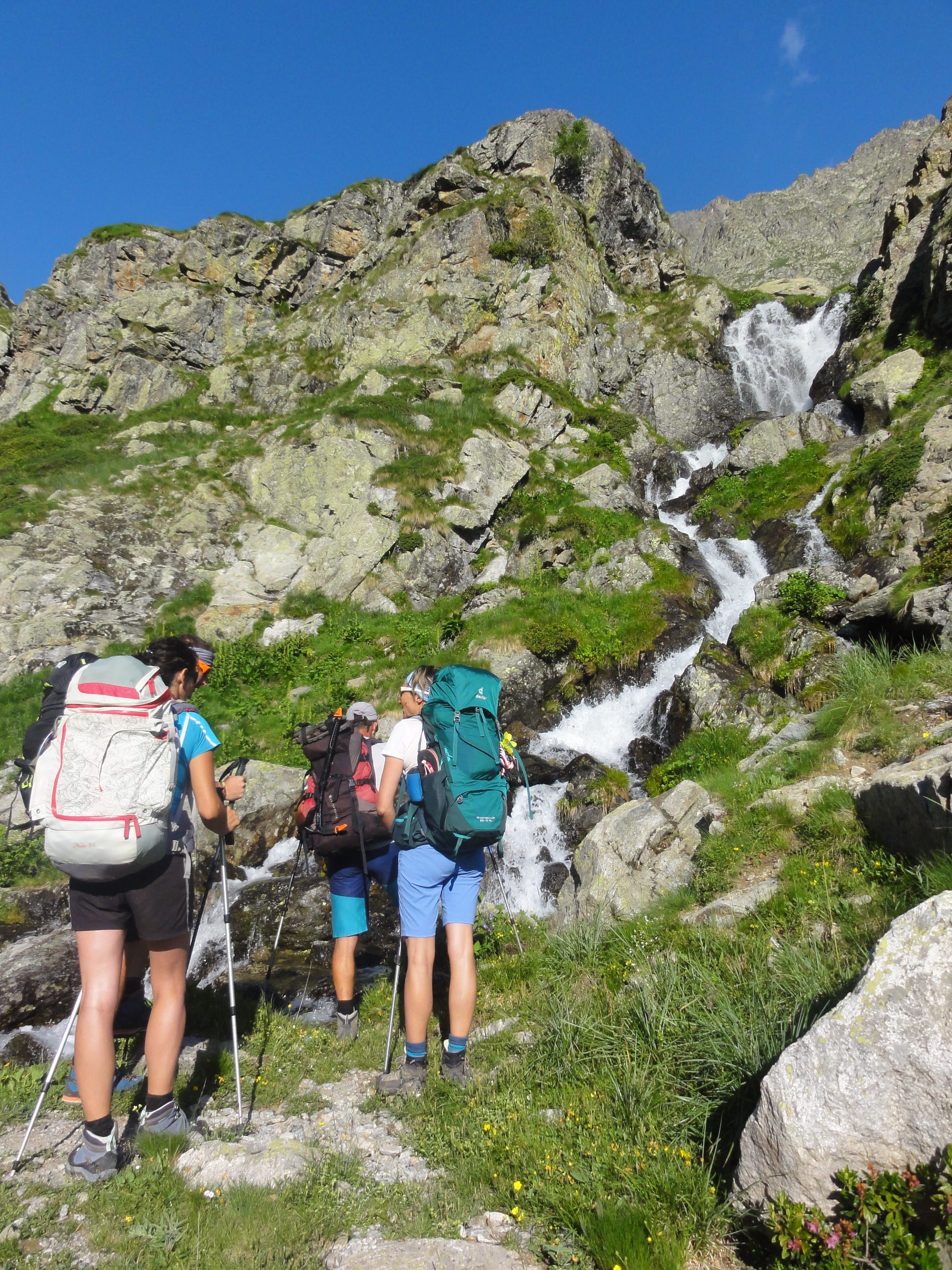 LaurianeJournée 6Départ pour notre dernière journée. Nous quittons l’Italie. Les corps commencent à souffrir. Le parcours est superbe, entre ruisseaux, cascades et névés. Les chamois, bouquetins, marmottes et fleurs superbes sont toujours très présents. Nous rejoignons le col du Mercantour (2 639m) et certains gravissent la « Cime » quelques pas plus haut (2 772m). Ponctuée par un pique nique au bord du ruisseau la longue descente nous guide à notre refuge de départ, Le Bornéon, après 15 km, 612D+ et 1511 de D-. Les genoux ont un peu reçu sur cette belle descente et la convivialité du refuge (malgré un gardien – Maxime – légèrement dépressif) ponctue une semaine formidable.Edouard et Malika