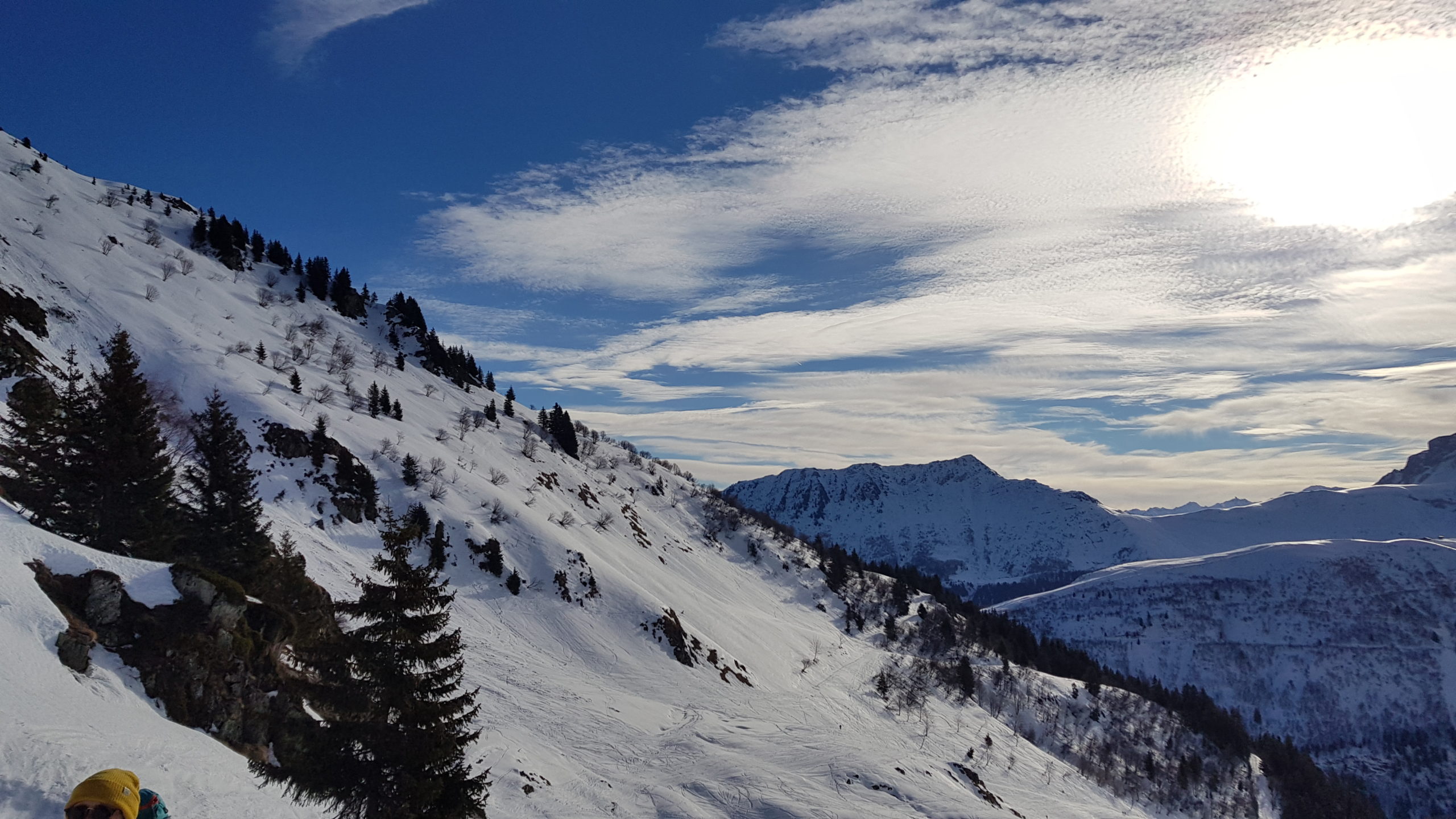Test arva fait dans les règles de l’art ! Nous avons démarré cette balade par une petite mise en jambes et les degrés montant les couches de vêtements diminuent. Un coup d’œil dans le rétro et là le spectacle est haut en couleur, tant le ciel est magnifique !!! Petite pause banane pour se redonner la patate et engager quelques passages techniques du « posage de ski équilibre ».