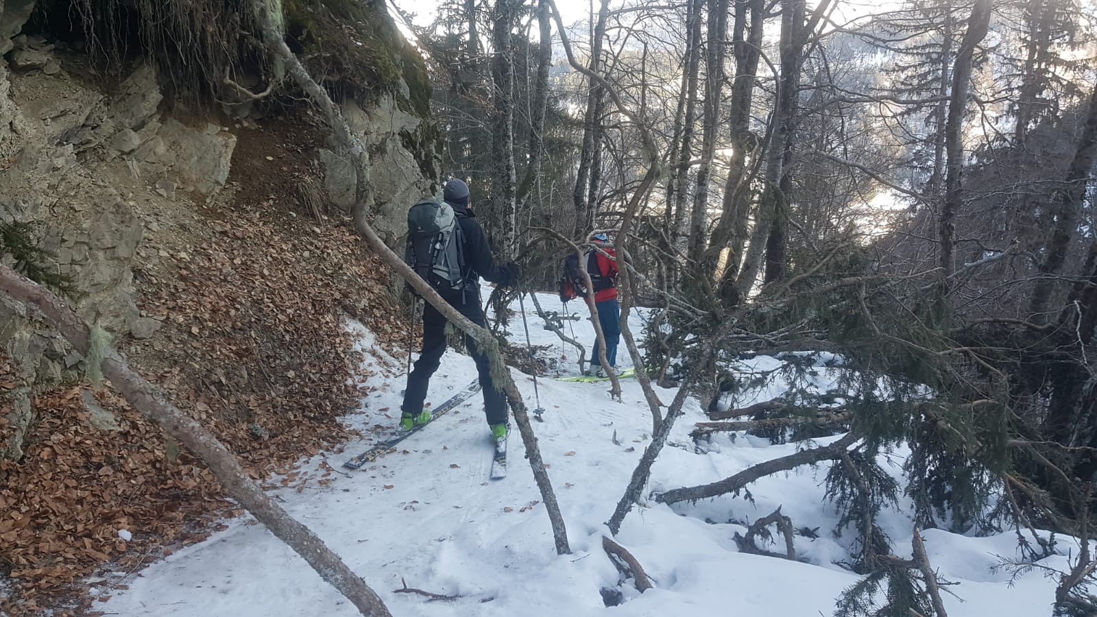 La fin du chemin fut jalonnée de quelques obstacles : traversée de ruisseaux, tas de feuilles, passage sous des branchages entre-mêlés. Les plus téméraires ont tentés de garder les skis aux pieds jusqu’au bout.