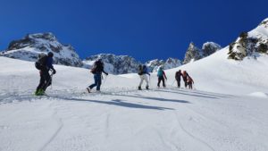Pour ce dimanche 13/2/22, Bertrand propose une belle sortie : le tour de la Combe Bronsin en Lauzière. Objectif : 1 300 m de dénivelé, avec quelques manipulations de matériel (repeautage, couteaux, et possible nécessité d’utiliser des vrais crampons).