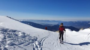Une fois en haut, ceux qui avaient anticipé le port des crampons, traversent à pied. Pour les autres, la traversée à ski se fait facilement car la neige est douce.