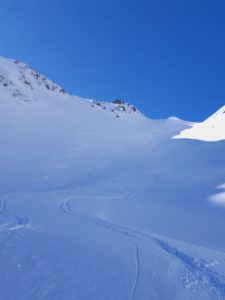 Il nous conseille d’emblée d’atteler nos couteaux, car la neige se durcit visiblement dans la pente. Pour moi qui ai relativement peu d’expérience en ski de rando et pour qui les conversions sont parfois approximatives, ceux-ci me permettent de monter sans trop de difficulté. C’est Bertrand qui est à la trace et qui presse l’allure. Arrivés au col, la vue est somptueuse sur toute la chaine du Mont-Blanc. Nous ne tardons pas à dépeauter et à nous élancer dans cette fameuse face Nord, qui nous offre, comme espéré, quelques minutes de pure glisse poudrée ! Et s’il nous reste encore plusieurs heures de labeur devant nous, nous savons déjà qu’elles en valaient largement la peine.