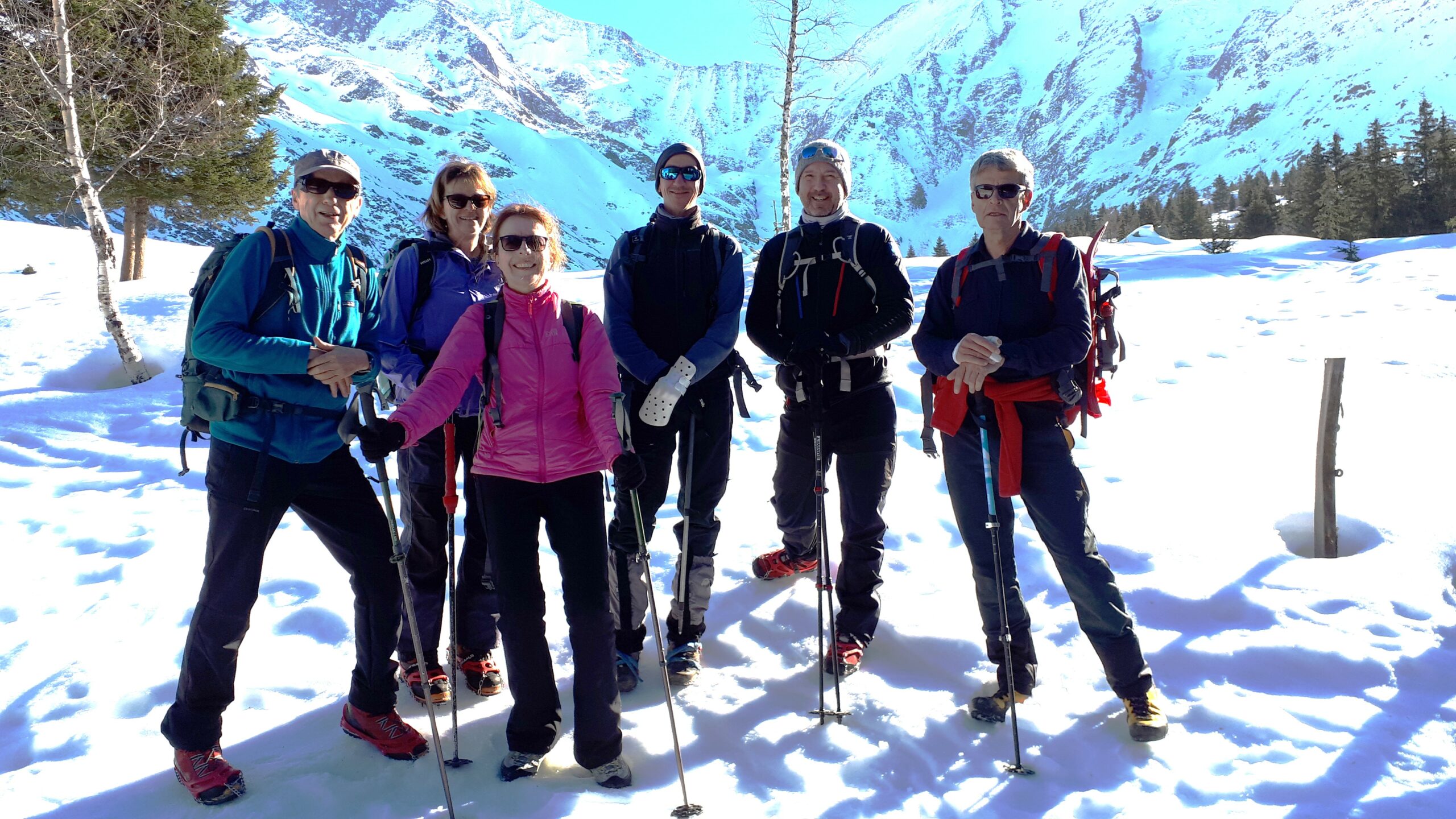 Sortie Raquettes les Contamines le 04/02/2024 : Caroline, Catherine 1, Catherine 2, Gérald, Claude, Alex et Marc (les éclopés !).
