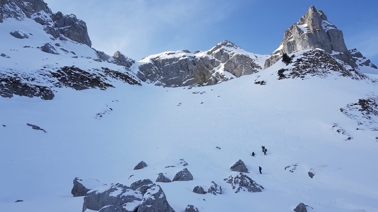Arrivé au bas de ce bel endroit, nous re-peautons pour monter au-dessus des grottes de Montarquis, pour une descente dans assez peu de neige. Dure par endroit, déjà décaillée à d’autres, et plutôt bonne ensuite. Il n’est pas tout à fait midi mais le soleil tape fort.