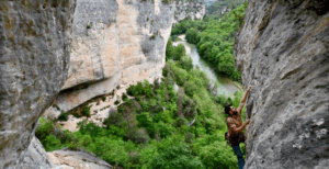 Les gorges du Tarn, c’est des lignes majeures essentiellement dans le 6 (et plus si affinité) sur du calcaire à trous. Des voies d’une longueur (parfois au delà de 40m, bien lire le topo !), des grandes voies le tout sur des falaises verticales ou déversantes avec de bonnes prises, pour une escalade à dominante athlétique et continue… le tout survolé par les vautours. Magnifique !