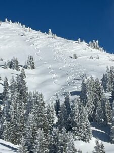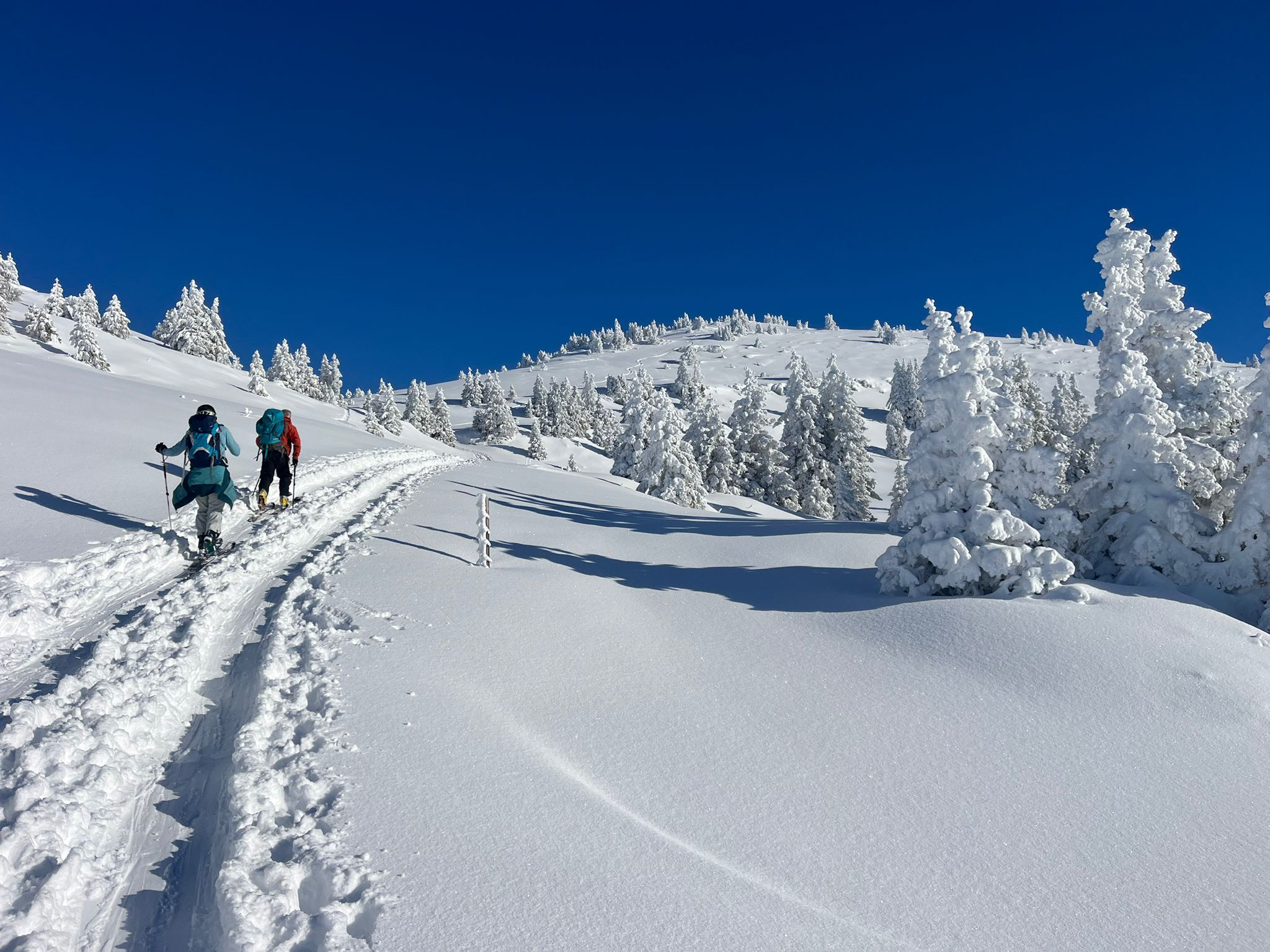 Au début de la descente, nous suivons la piste jusqu’à un champ vierge de trace. Une dernière petite montée à pied ou à ski selon les envies et nous entamons la descente dans la forêt au pas. Attention aux cailloux !