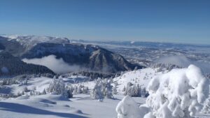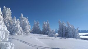La neige est au rendez-vous dès le départ. Montée dans la forêt toute blanche en suivant la piste. L’ambiance est top ! A la sortie de la forêt, la vue se dégage et on aperçoit le sommet.