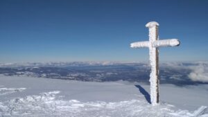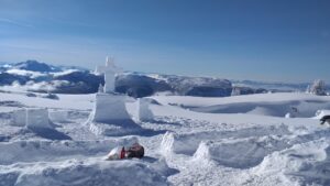 Au sommet, nous croisons un groupe de père de famille en pèlerinage qui ont construit un autel en glace pour célébrer une messe. On en profite pour manger un bout.