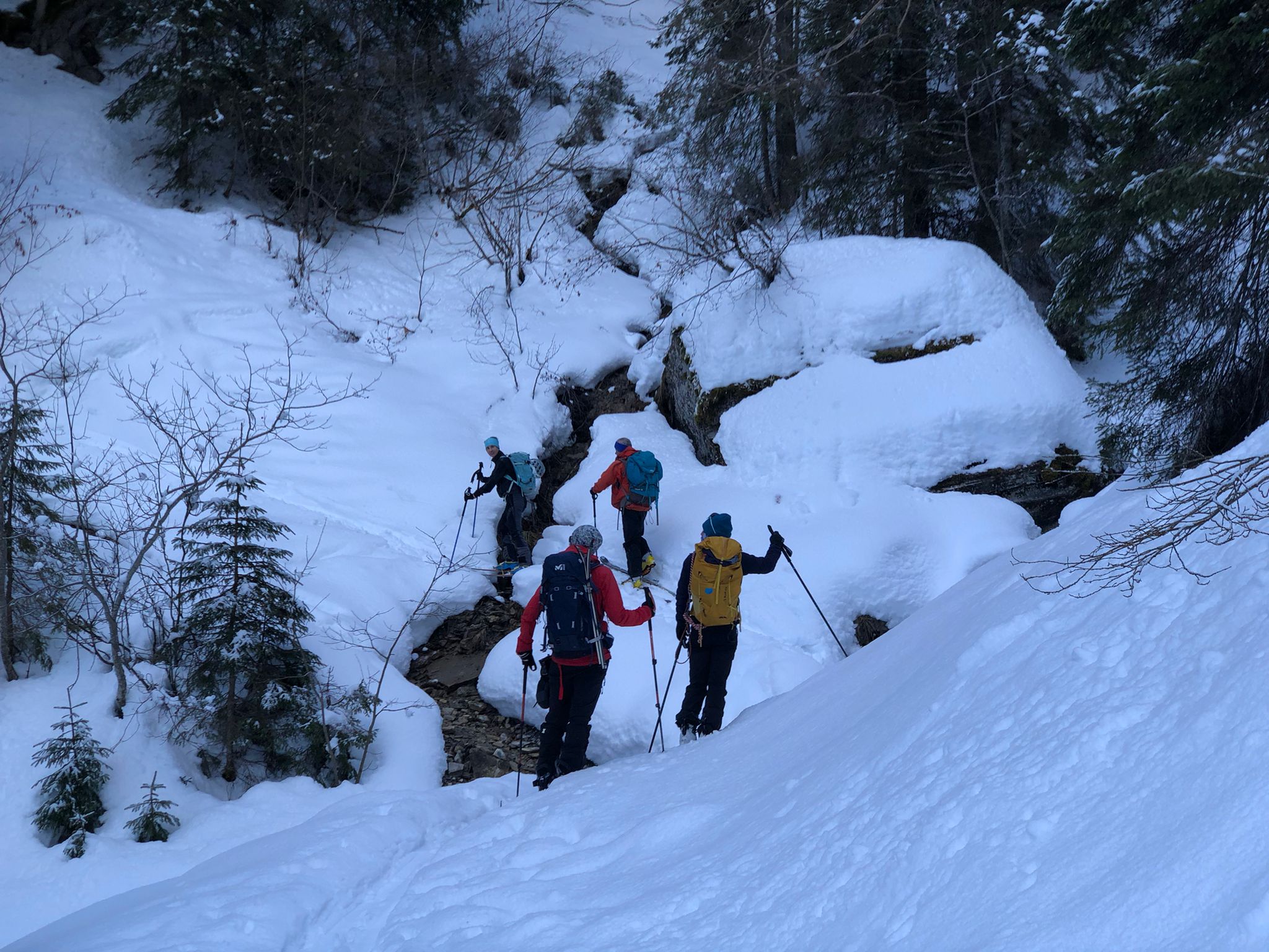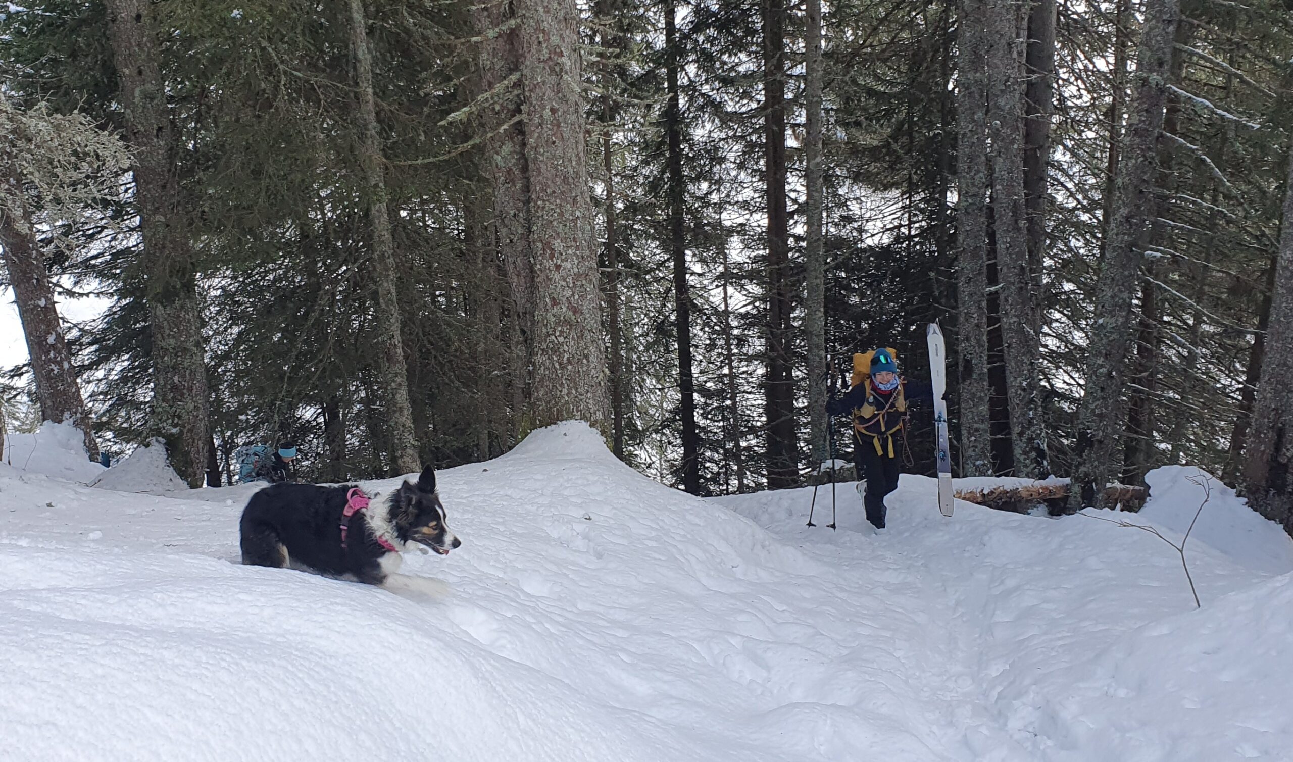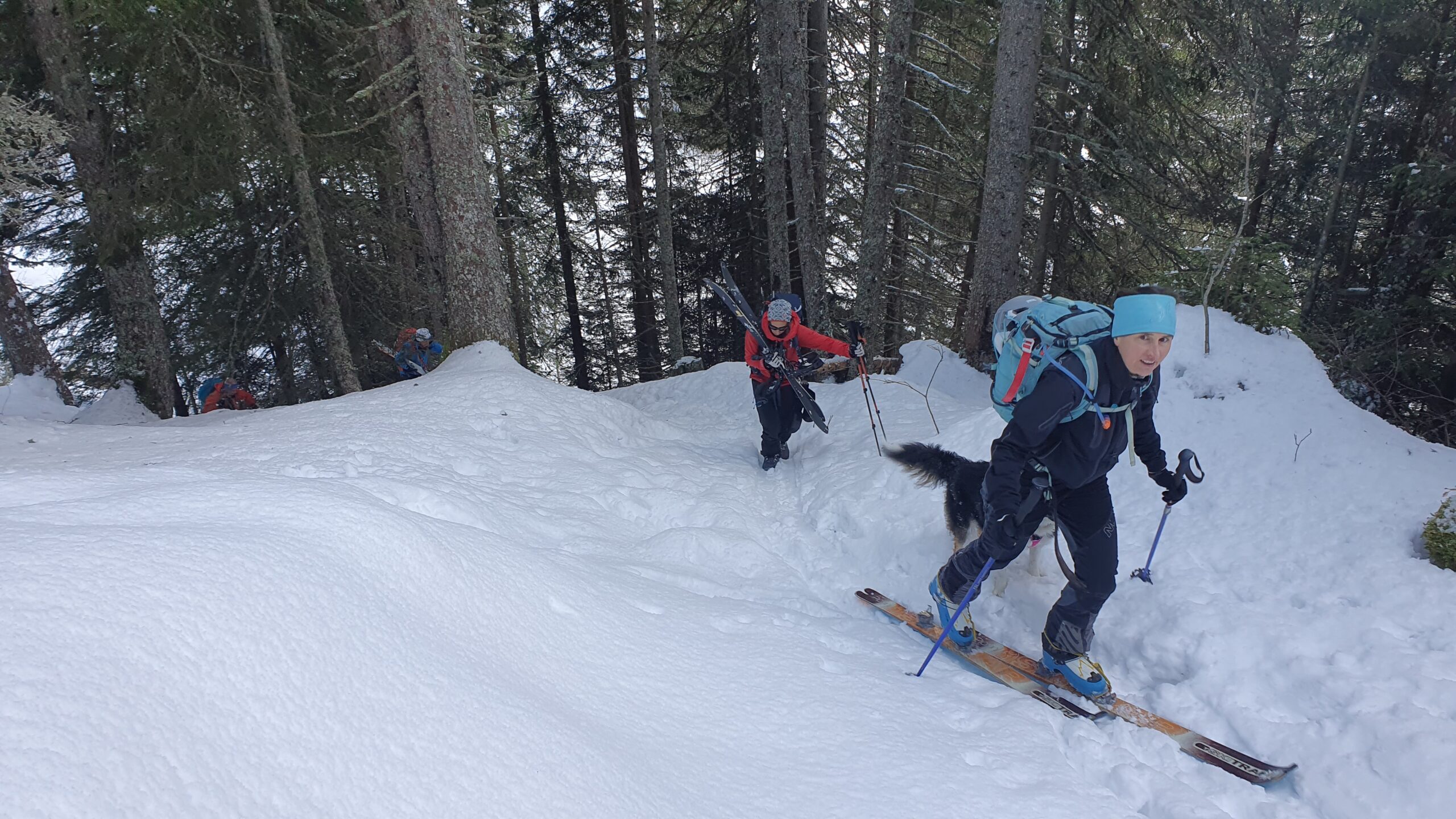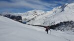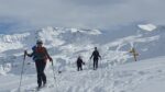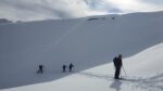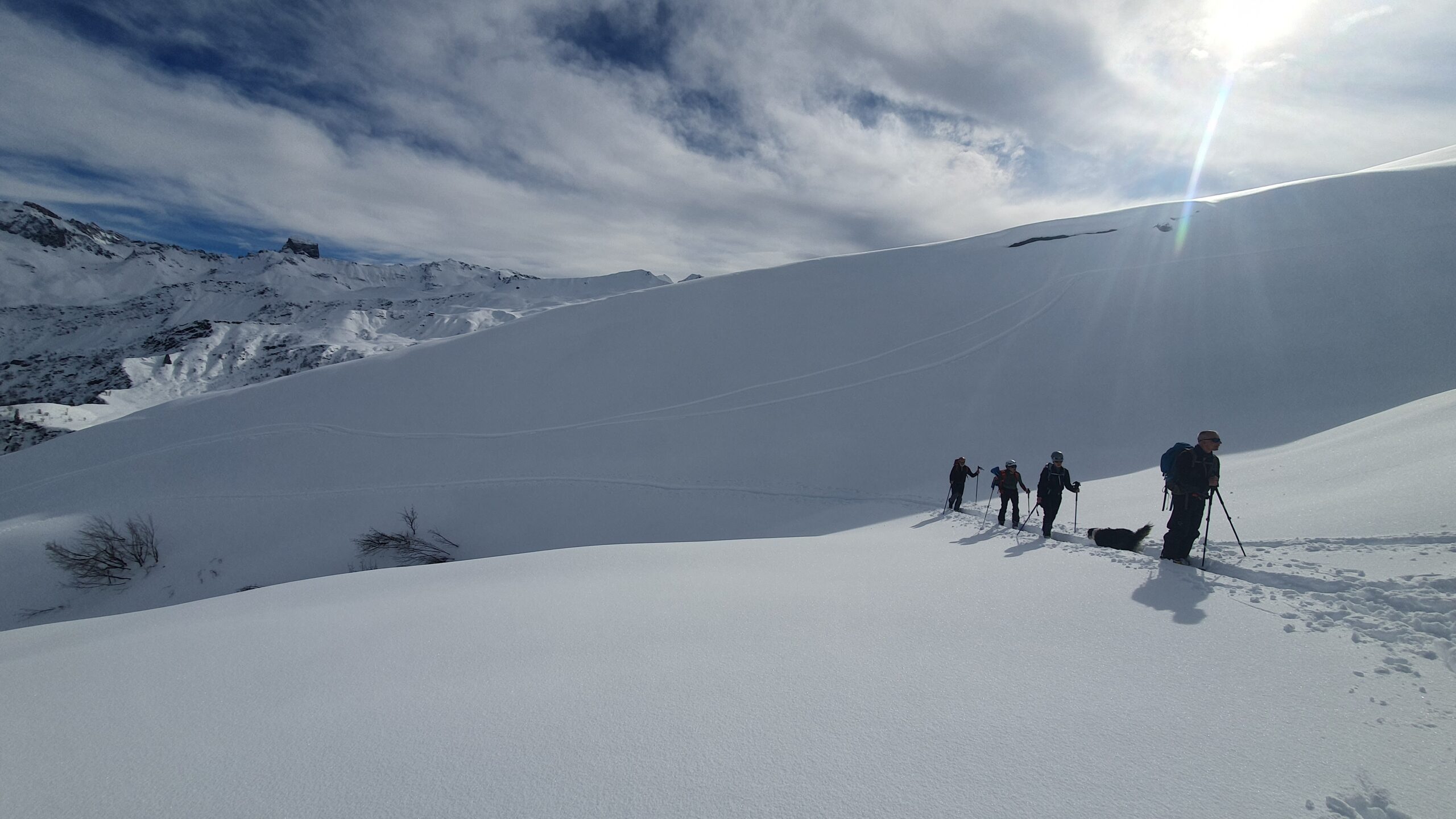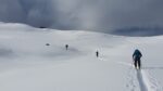 Un petit groupe de 4 skieurs prend les devants, assurent une belle trace esthétique, les poursuivants au nombre de 3 se tirent la bourre pour rester dans le jeu : au gré de la neige qui botte sous les peaux, des chutes à l’arrêt, et des pauses photos obligatoires … la stratégie se joue à peu de chose pour rester dans le rythme ou se faire décrocher !