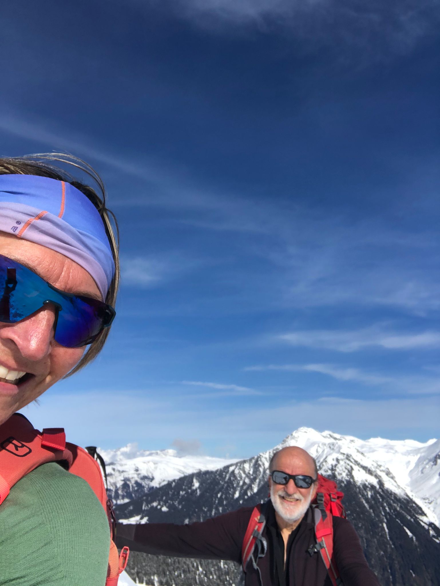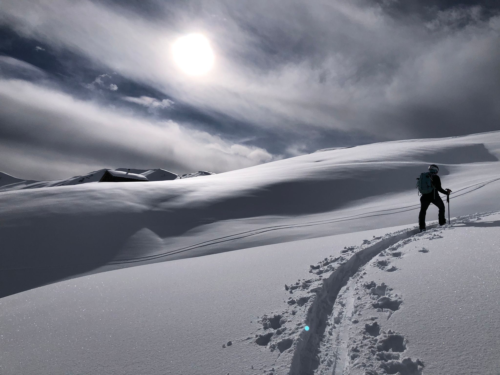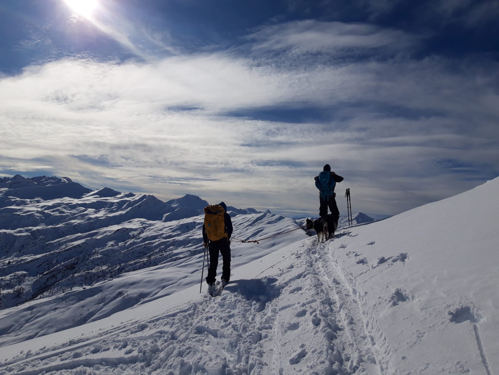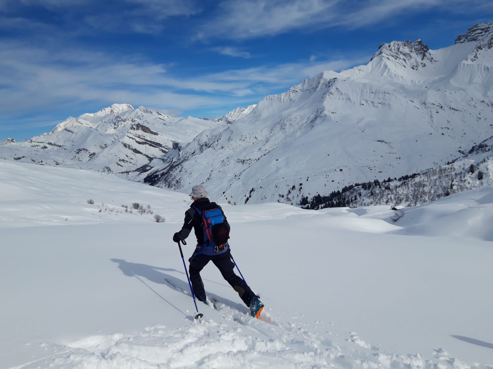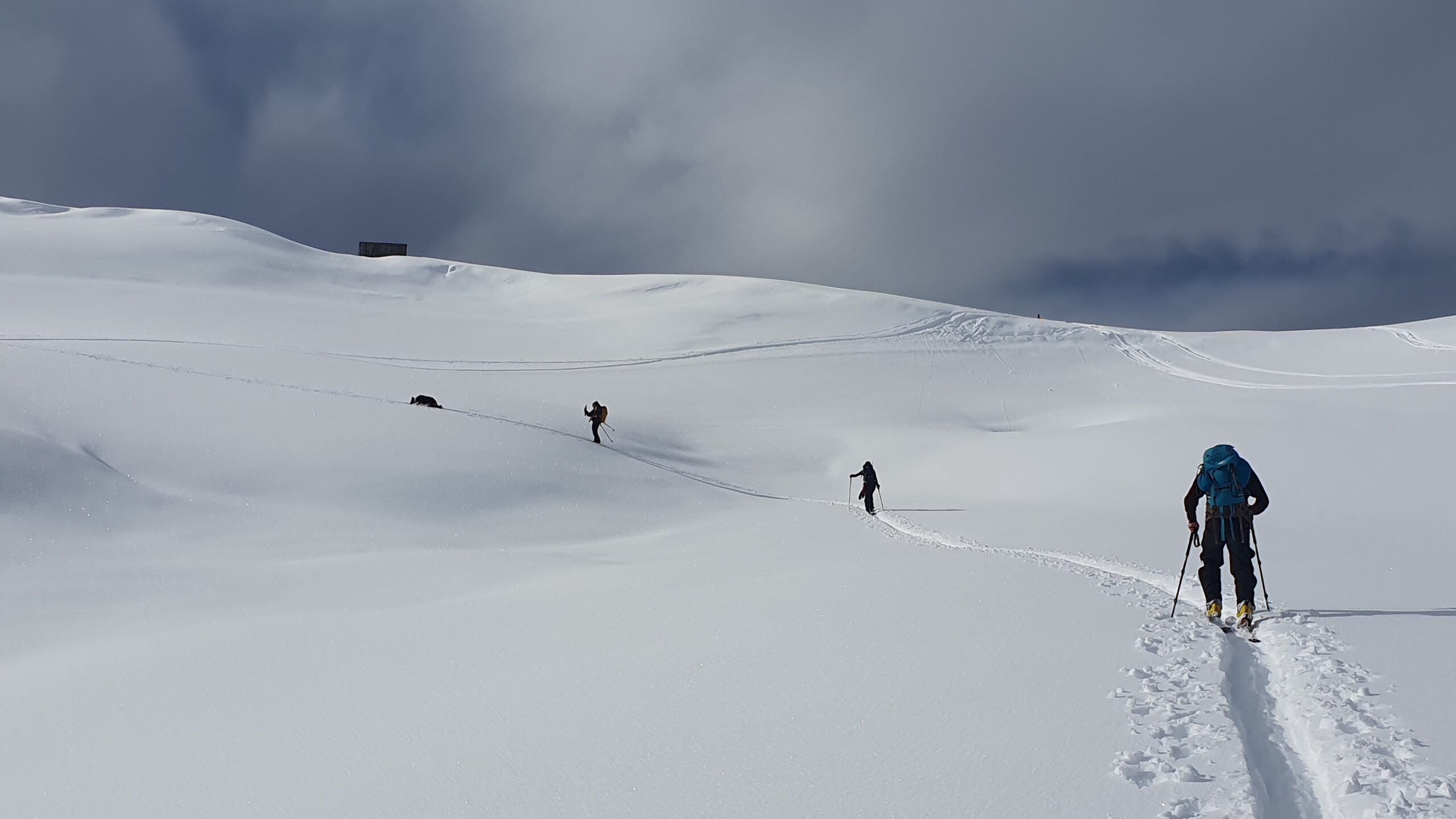 Un petit groupe de 4 skieurs prend les devants, assurent une belle trace esthétique, les poursuivants au nombre de 3 se tirent la bourre pour rester dans le jeu : au gré de la neige qui botte sous les peaux, des chutes à l’arrêt, et des pauses photos obligatoires … la stratégie se joue à peu de chose pour rester dans le rythme ou se faire décrocher !