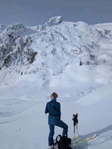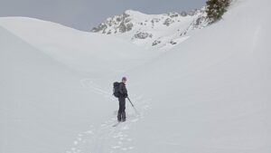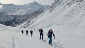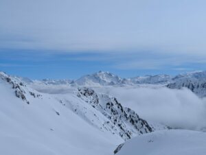 Devant nous, quelques groupes dont celui du CAF de Chambéry. L’une des traces grimpe fort dès le début. 2 d’entre nous optent pour celle-ci alors que les autres prennent la décision du zig-zag. Le soleil brille généreusement. Les couches d’épaisseur sur nos corps rejoignent le fond des sacs, ainsi que le collant de l’une de nous (très rapide dans la manipulation 😊).