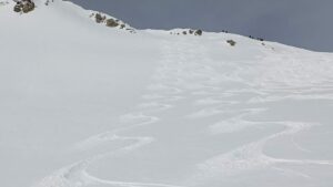 Nous voilà repartis pour les 600 m restants. La neige est encore bonne, de quoi encore faire ses propres traces. Et là… changement de terrain, la légère croute du matin est de retour. Pour ma part, les skis me guident et non mes cuisses. Bref, quand faut descendre, faut descendre. Chacun son style avec plus ou moins d’aisance avec comme point de ralliement Sévak qui a pris les devants.