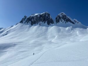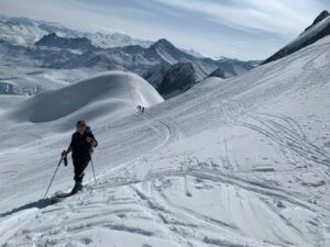 Nous prenons la direction de la combe du plan à notre rythme et savourons notre chance d’être là, du moins pour ma part. Le panorama est toujours aussi beau et le soleil est de la partie alors que ce matin en partant le ciel était bien voilé. La neige, quelque peu croutée, n’engage rien de bon.
