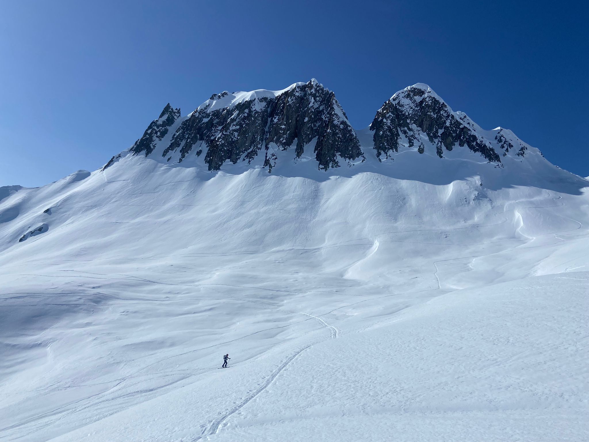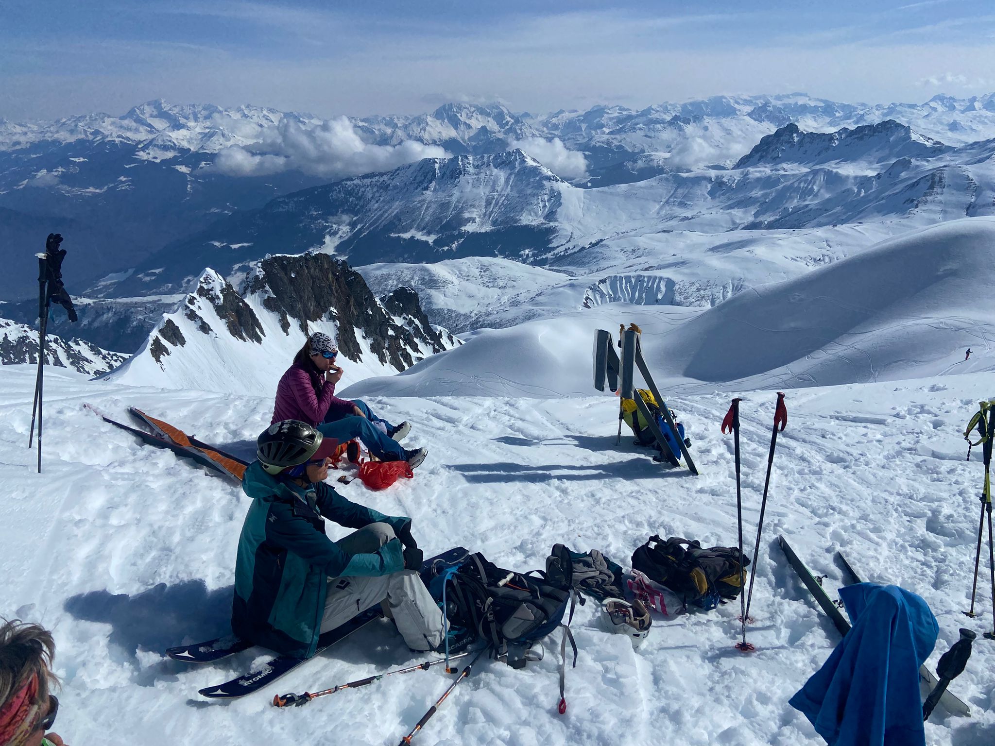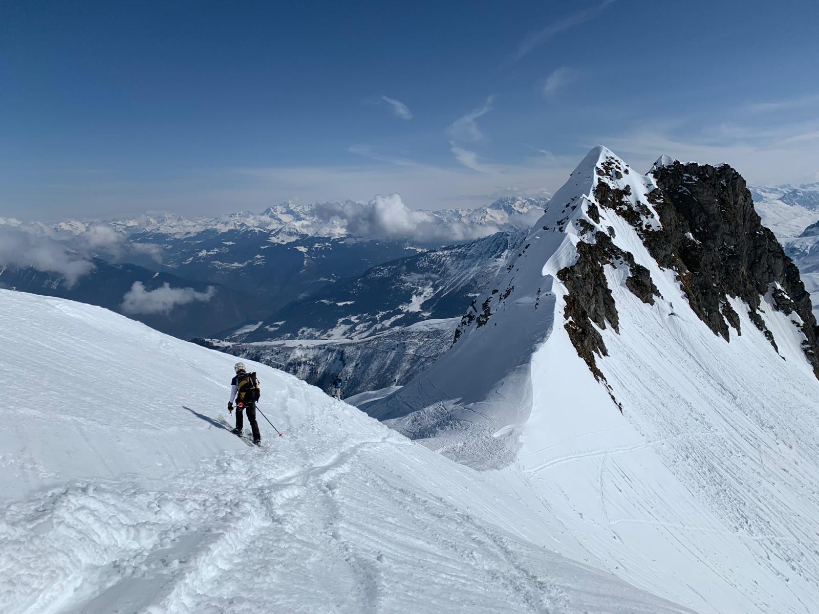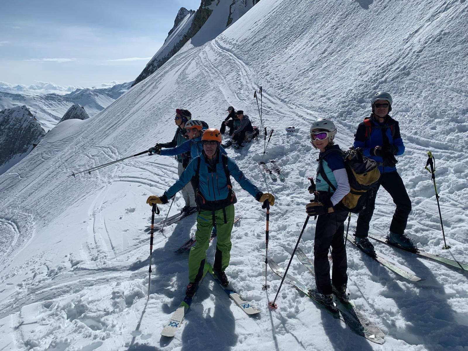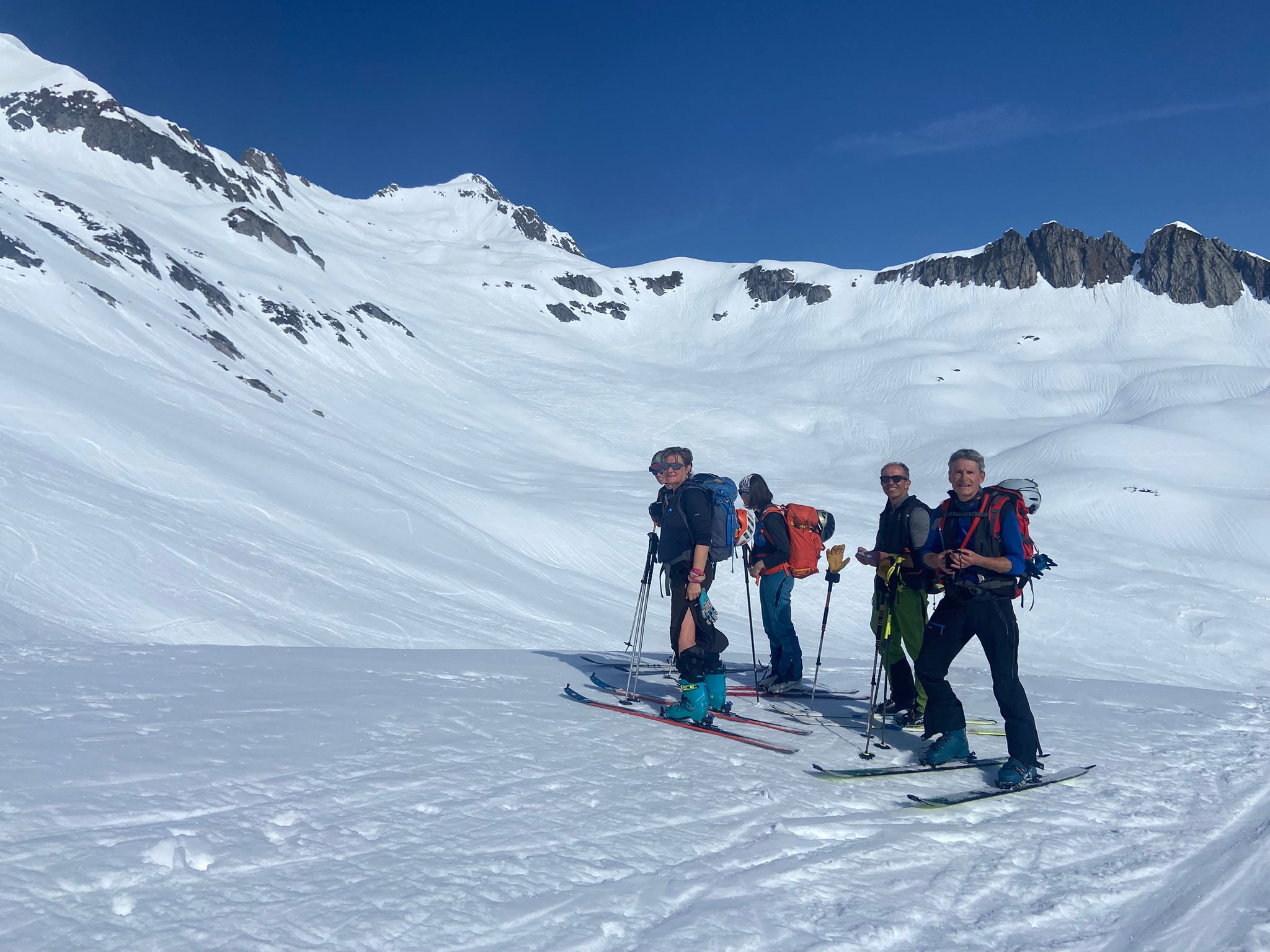 Nous prenons la direction de la combe du plan à notre rythme et savourons notre chance d’être là, du moins pour ma part. Le panorama est toujours aussi beau et le soleil est de la partie alors que ce matin en partant le ciel était bien voilé. La neige, quelque peu croutée, n’engage rien de bon.