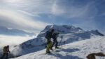 Arrivée à bon port, on attaque dans une neige dure et croutée à souhait, il est fort probable qu’on ai tous eu la même reflexion en se demandant ce qu’on foutait là dans la brume mais la météo n’étant pas rancunière, elle nous a offert un joli spectacle avec une mere de nuages et rayons de soleil finalement au rdv pour notre ascension.