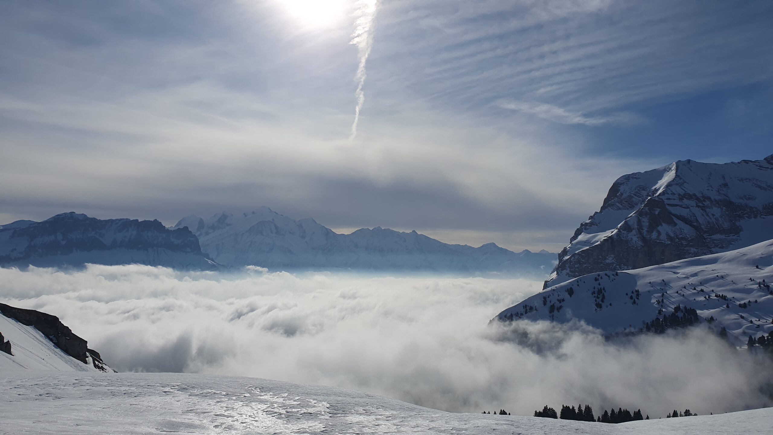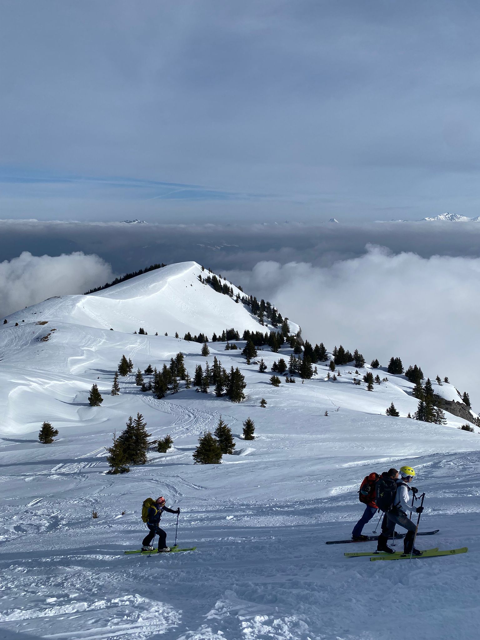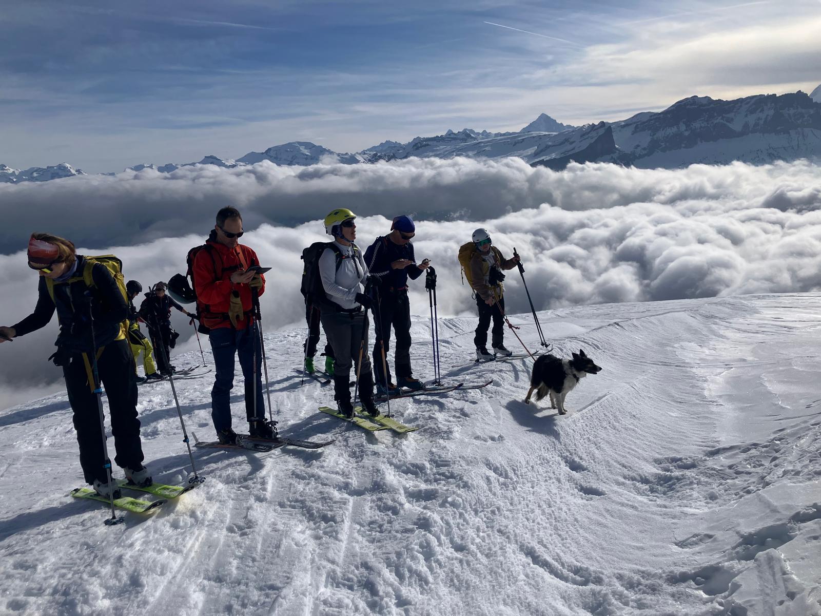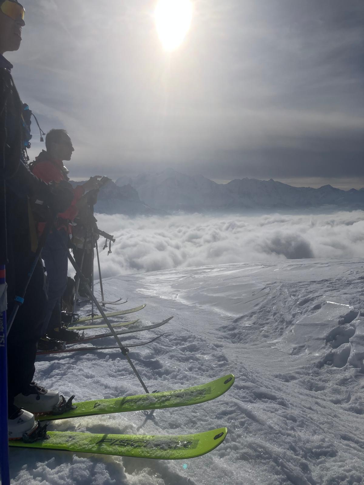 Arrivée à bon port, on attaque dans une neige dure et croutée à souhait, il est fort probable qu’on ai tous eu la même reflexion en se demandant ce qu’on foutait là dans la brume mais la météo n’étant pas rancunière, elle nous a offert un joli spectacle avec une mere de nuages et rayons de soleil finalement au rdv pour notre ascension.