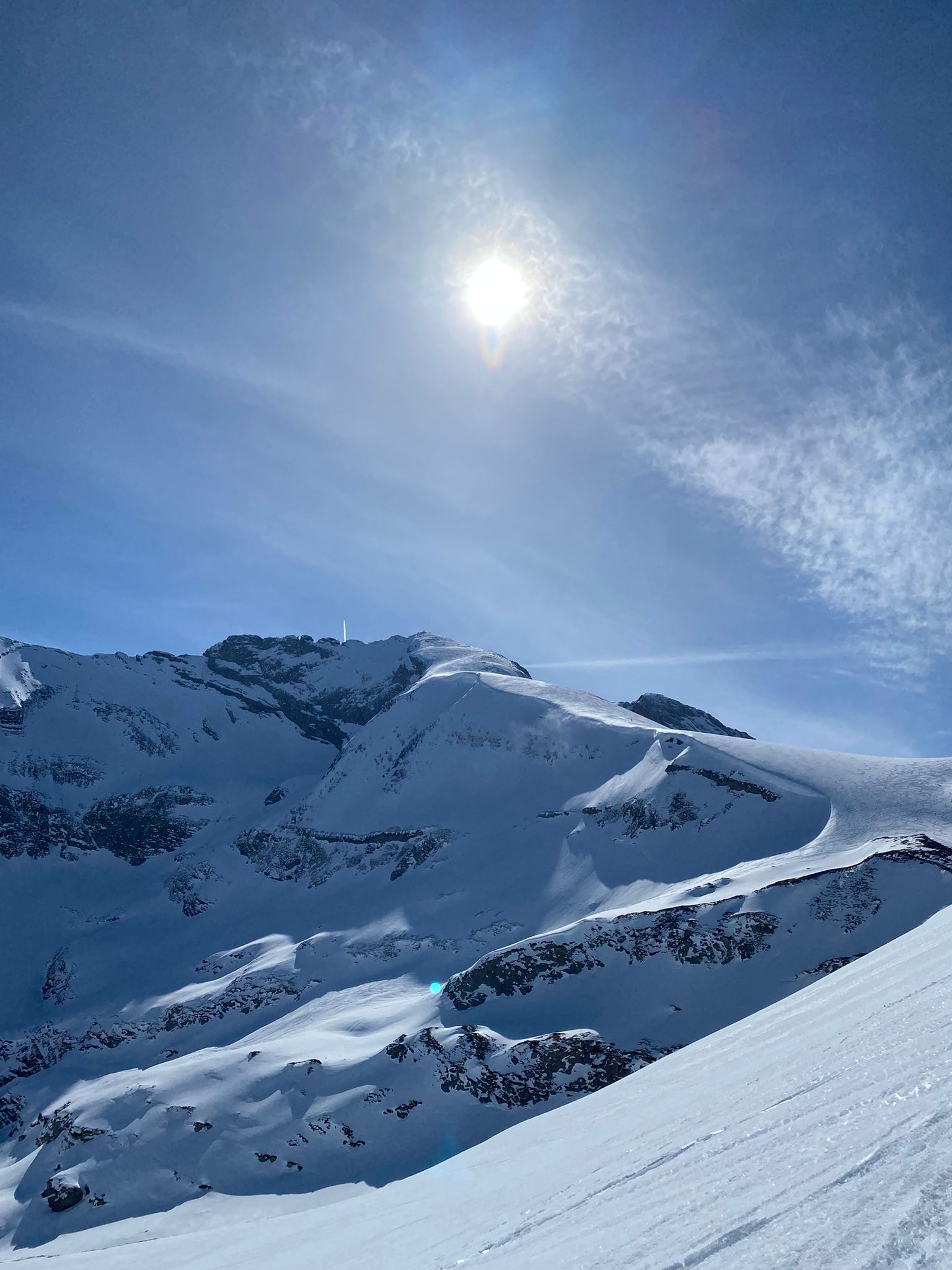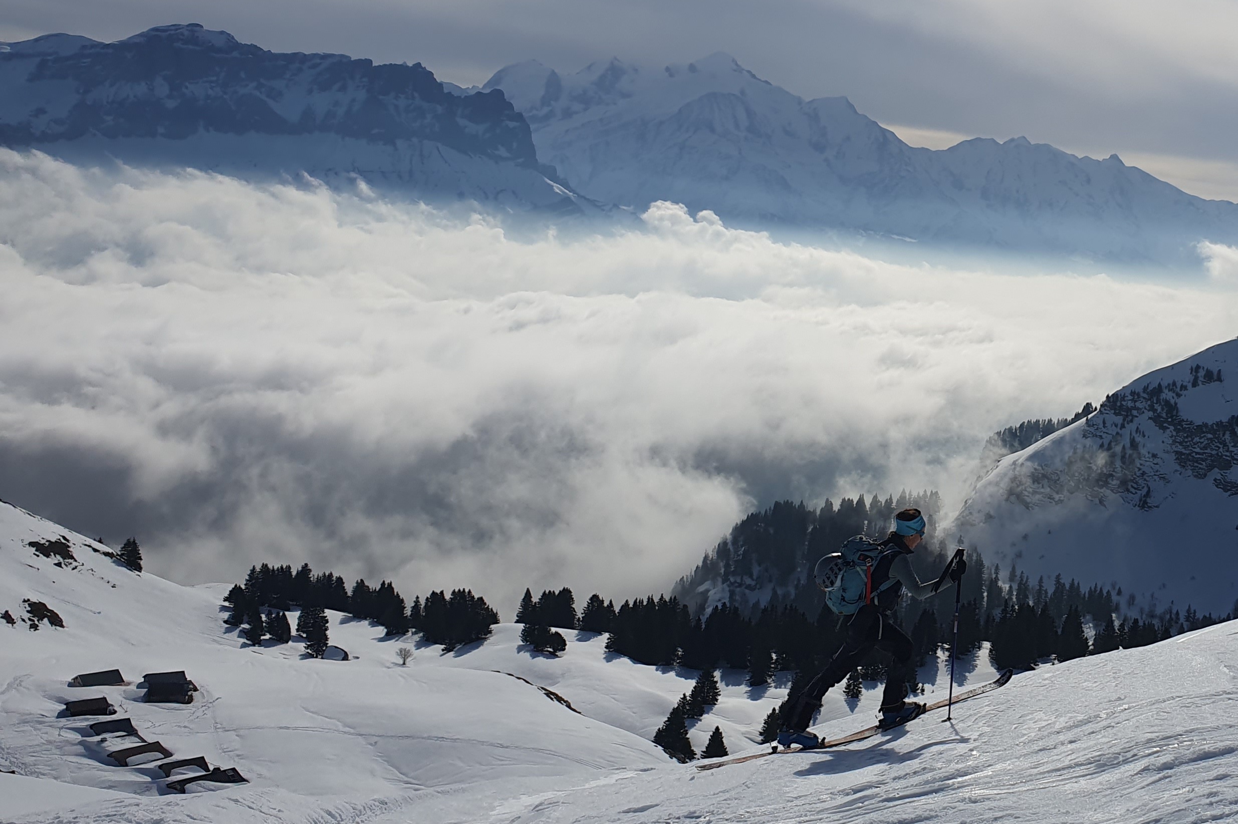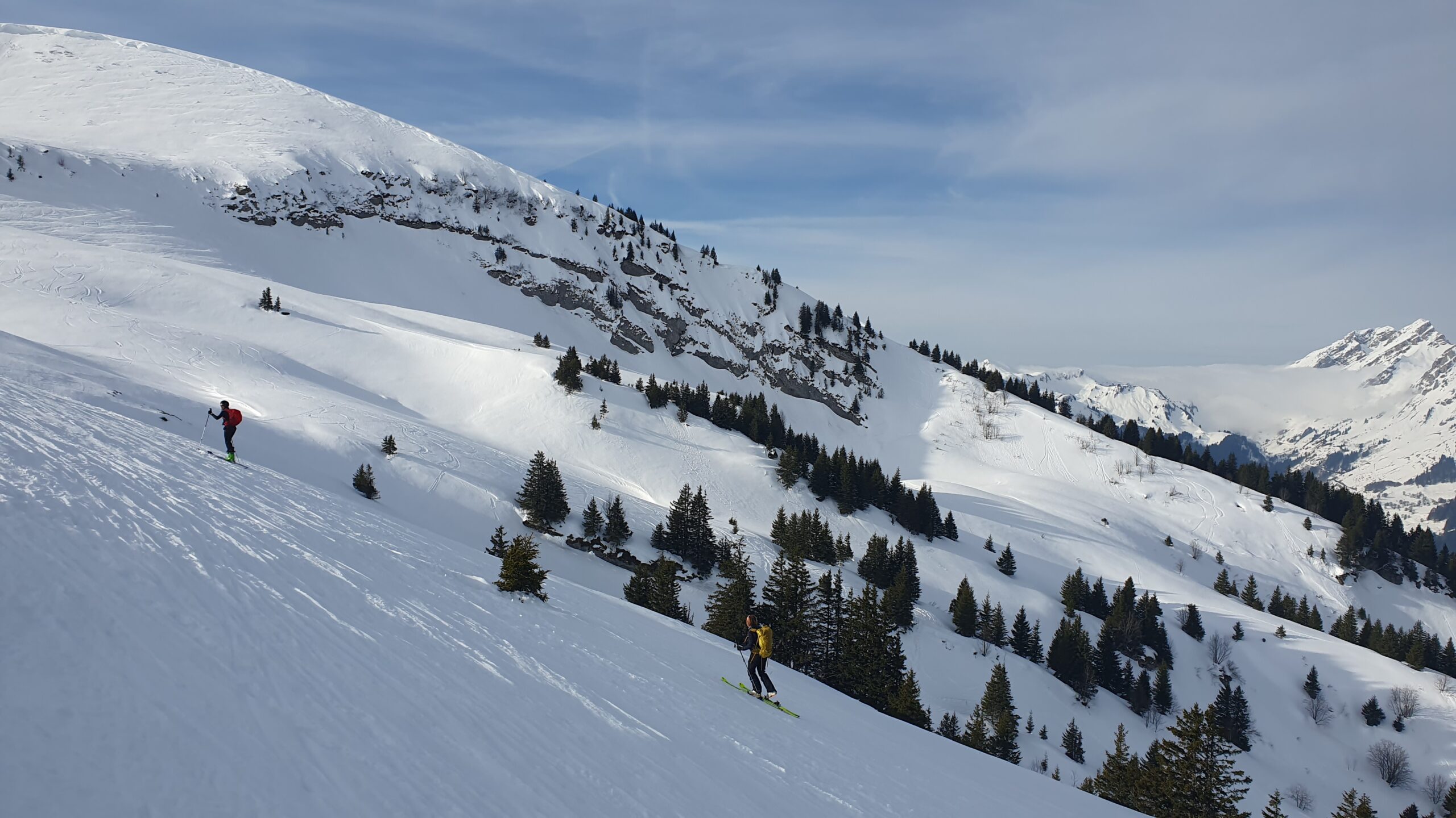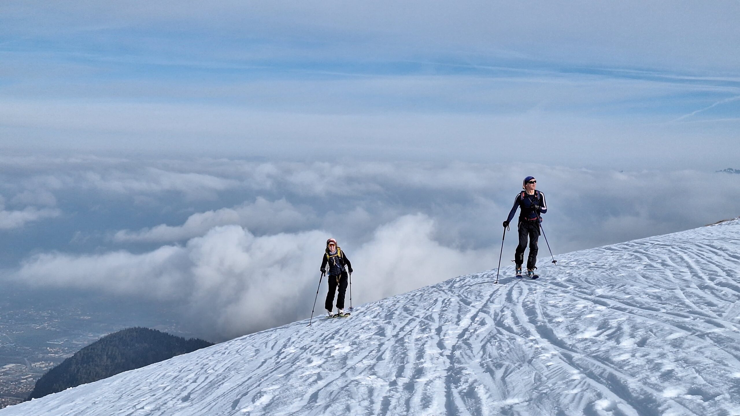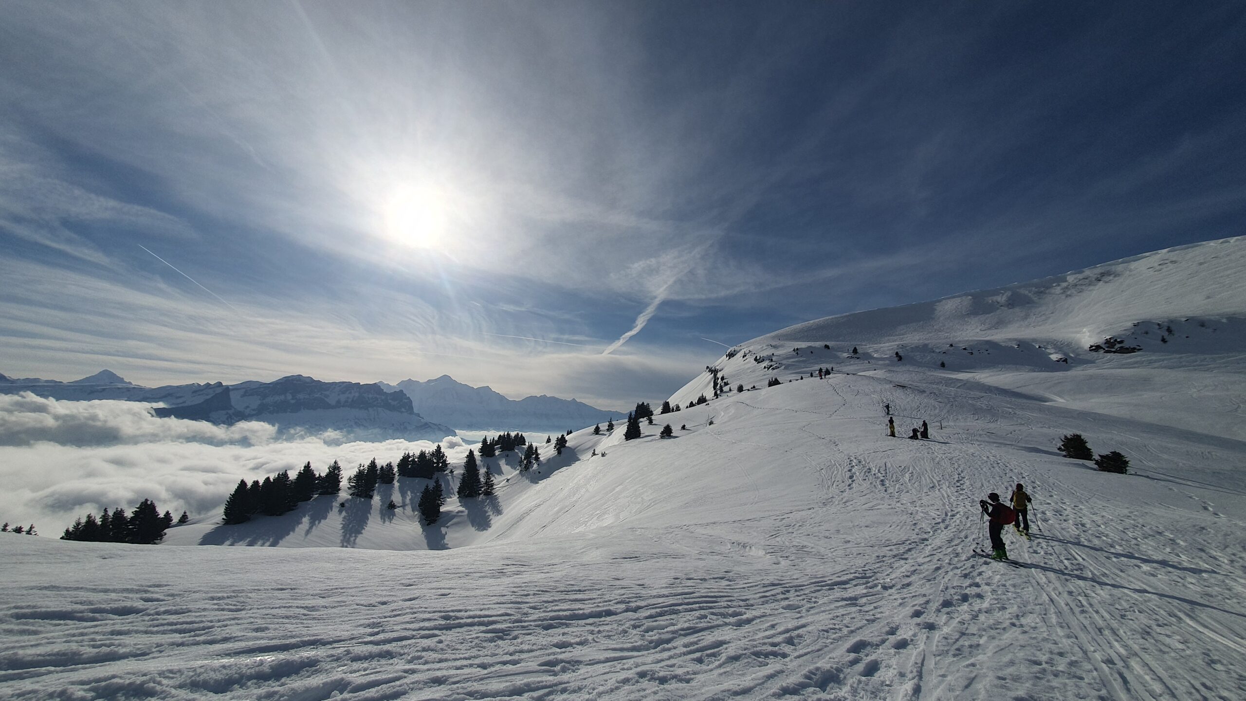 Arrivée à bon port, on attaque dans une neige dure et croutée à souhait, il est fort probable qu’on ai tous eu la même reflexion en se demandant ce qu’on foutait là dans la brume mais la météo n’étant pas rancunière, elle nous a offert un joli spectacle avec une mere de nuages et rayons de soleil finalement au rdv pour notre ascension.