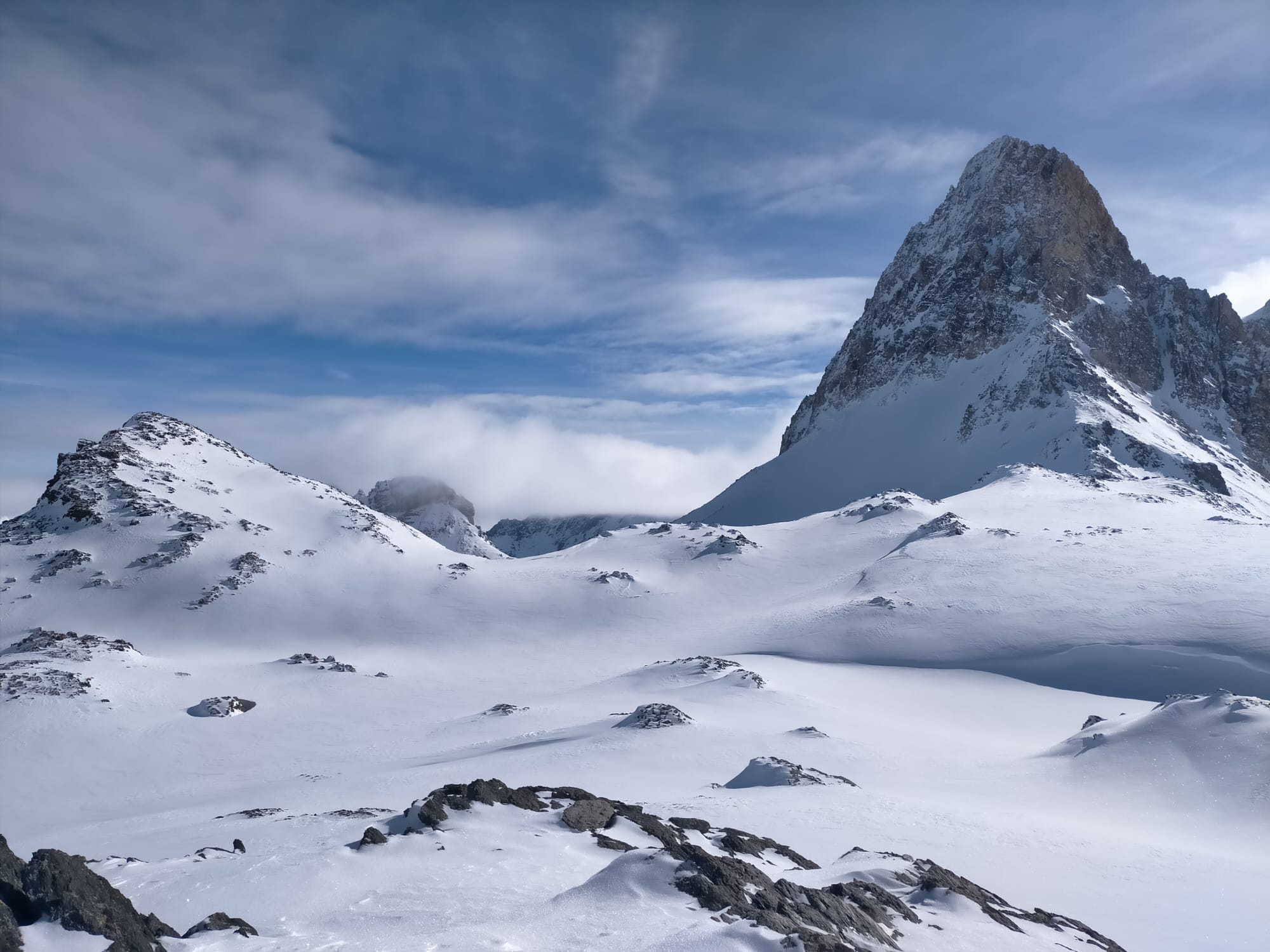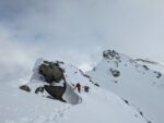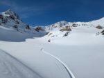 Il fait beau, mais le vent est bien là ! Remontée de du vallon en direction de la pierre du déjeuné, puis du passage du Pic du Thabor. Nous croisons nos traces de la veille. Nous poussons la montée jusqu’à la pointe de Terre Rouge, et nous dépassons de nouveau les 3000m. Descente des plus agréables de la pointe puis de la vallée en direction du Refuge des marches. Nous stoppons la descente vers 2600m pour la pause casse croûte. Il est temps de rejoindre Valfréjus. Montée plein est direction la petite pointe à 2817m au nord du col du cheval blanc, qui sera notre dernier sommet du week end. De là, il faut ruser, choisir le bon itinéraire de descente afin de ne pas avoir à repeauter. L’expérience de Jean Thomas paie et nous profiterons d’une neige 5 étoiles, d’un soleil radieux jusqu’à la station sans à avoir à mettre un coup de bâtons (enfin presque, il faut souligner que les skieurs lourds aux skis fartés avaient un certain avantage).