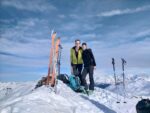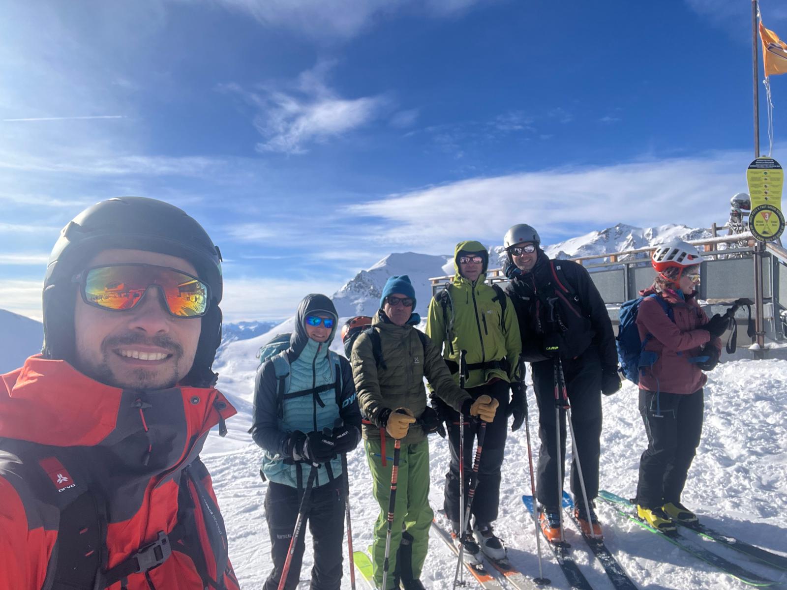 Arrivés à Valfréjus, petit problème de forfait réglé rapidement par Chloé et JT. Il fait frais mais très beau. Après une montée en télécabine, on patiente un peu pour l’ouverture du télésiège. Arrivés en haut du télésiège, check DVA et c’est parti pour un peu de hors piste pour se chauffer les cuisses.