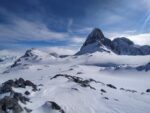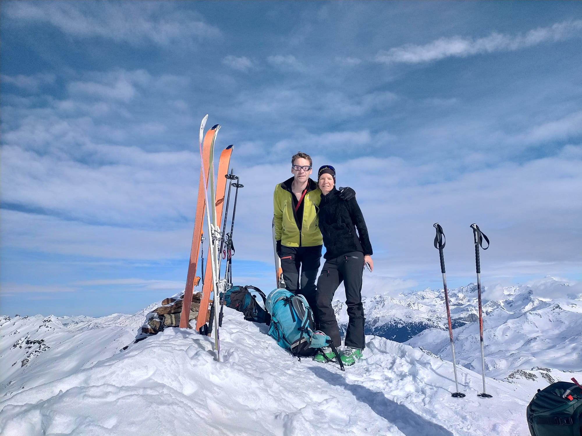 Au col du mont froid, 2937m, la pente se redresse. En prenant des distances, nous arrivons bientôt au sommet, ski sur le sac. Quel panorama! La Meige, les aiguilles d’Arve, le Goléon…